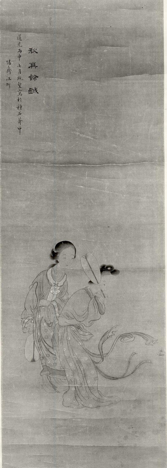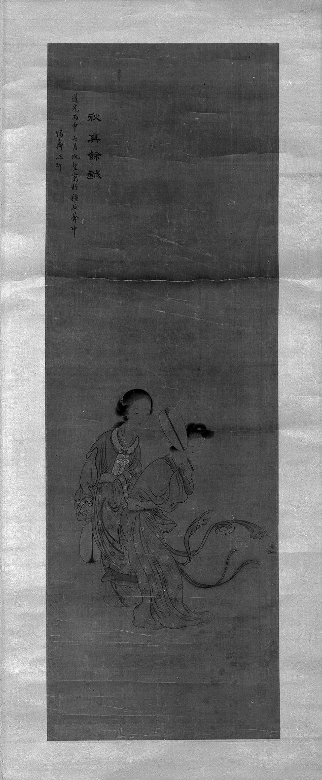 Two Court Ladies Watching a Butterfly, 19th century. Hanging scroll, ink and color on paper, no mounting: 37 x 12 1/4 in. (94 x 31.1 cm) overall: 82 1/2 x 17 in. (209.6 x 43.2 cm). Brooklyn Museum, Gift of Dr. and Mrs. John P. Lyden, 86.271.18. (Photo: Brooklyn Museum)