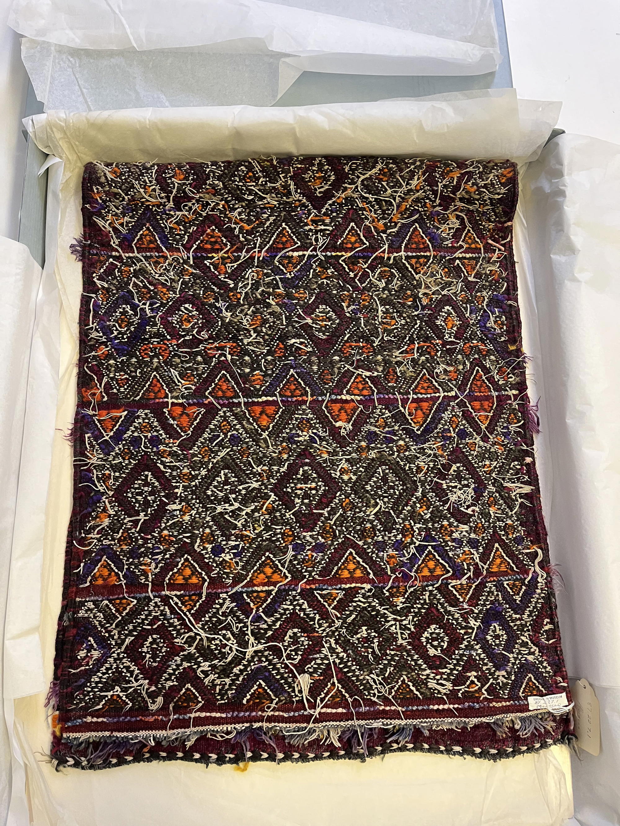 Possibly Ait Mgild; Possibly Ait Oumalou; Amazigh. Cushion Cover, Wool, cotton brocade, sequins, 52 x 20 x 3/16 in. (132.1 x 50.8 x 0.5cm). Brooklyn Museum, Gift of Dr. Virgil H. Bird, 87.227.1. (Photo: Brooklyn Museum)