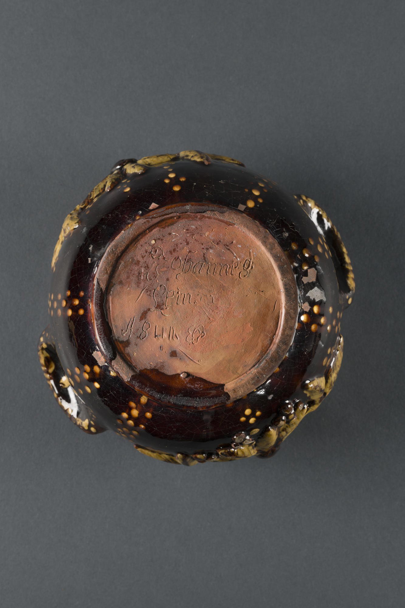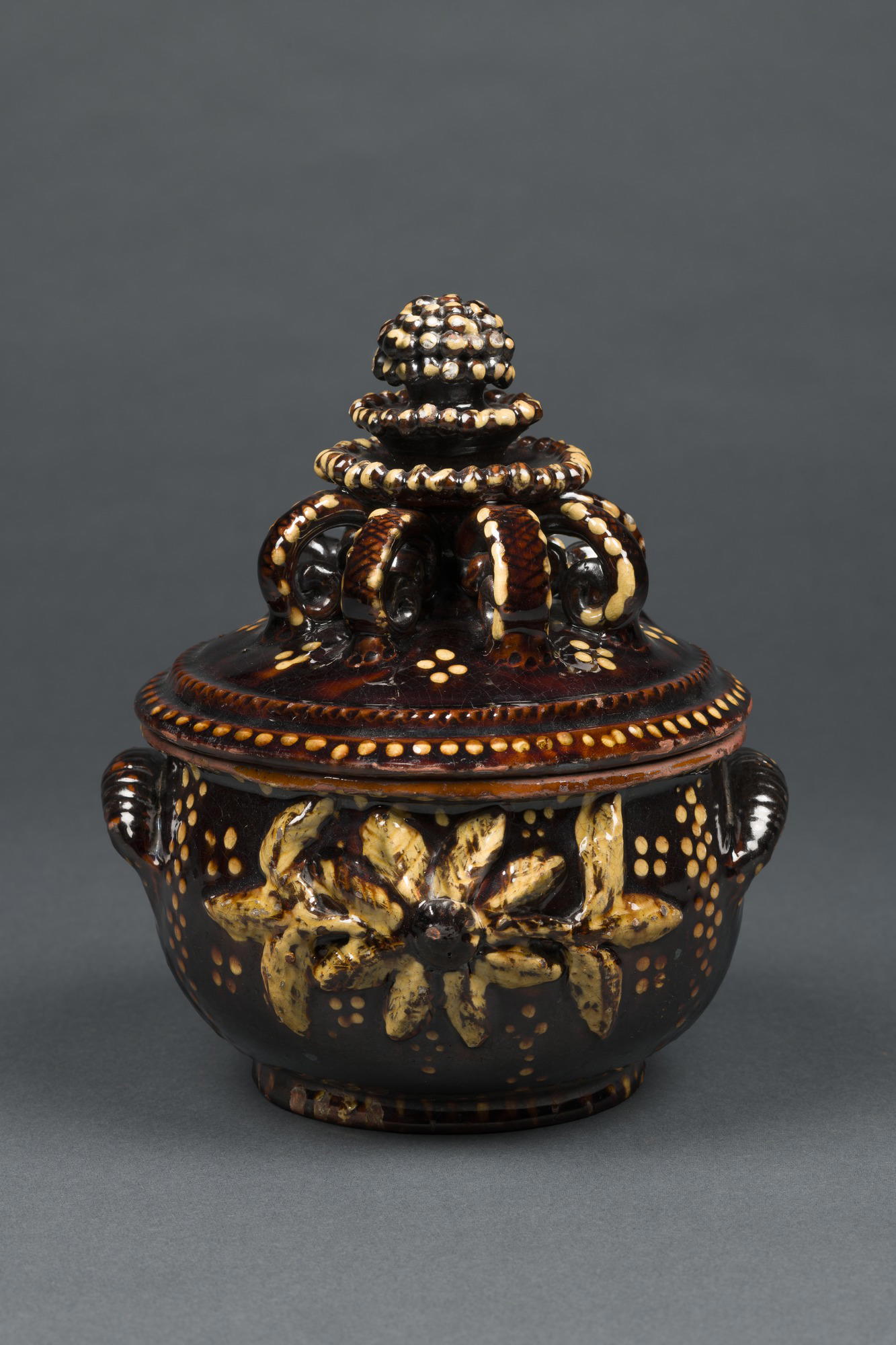Johannes Leman at Pottery of John Nase. Sugar Bowl with Lid, ca. 1830. Earthenware, 7 1/4 x 5 1/2 x 5 1/2 in. (18.4 x 14 x 14 cm). Brooklyn Museum, Gift of Huldah Cail Lorimer in memory of George Burford Lorimer, 57.75.18a-b. (Photo: Brooklyn Museum)
