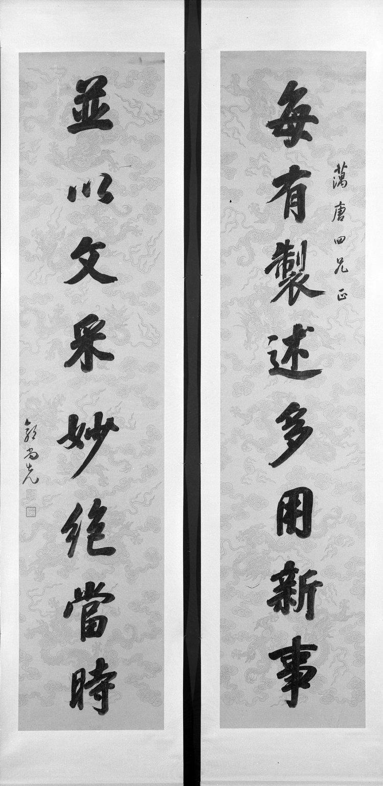 Guo Shangxian (Chinese, 1785–1833). Paired Hanging Scrolls, ca. 1825–1833. Ink on yellow paper, printed with gold and silver dragon motifs, Each scroll: 72 1/2 x 15 3/4 in. (184.2 x 40 cm). Brooklyn Museum, Purchased with funds given by the B.D.G. Leviton Foundation, 88.95a-b. (Photo: Brooklyn Museum)