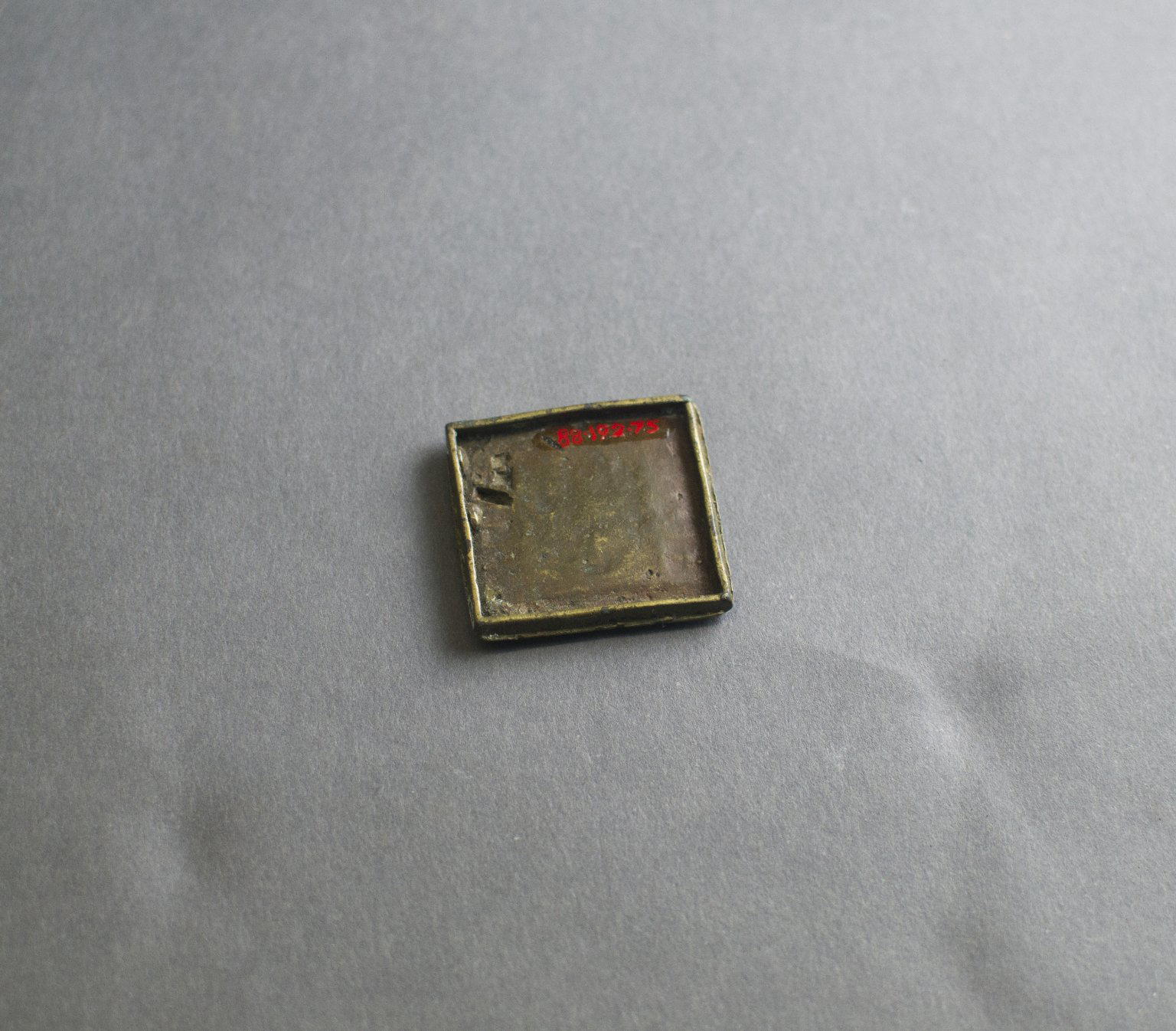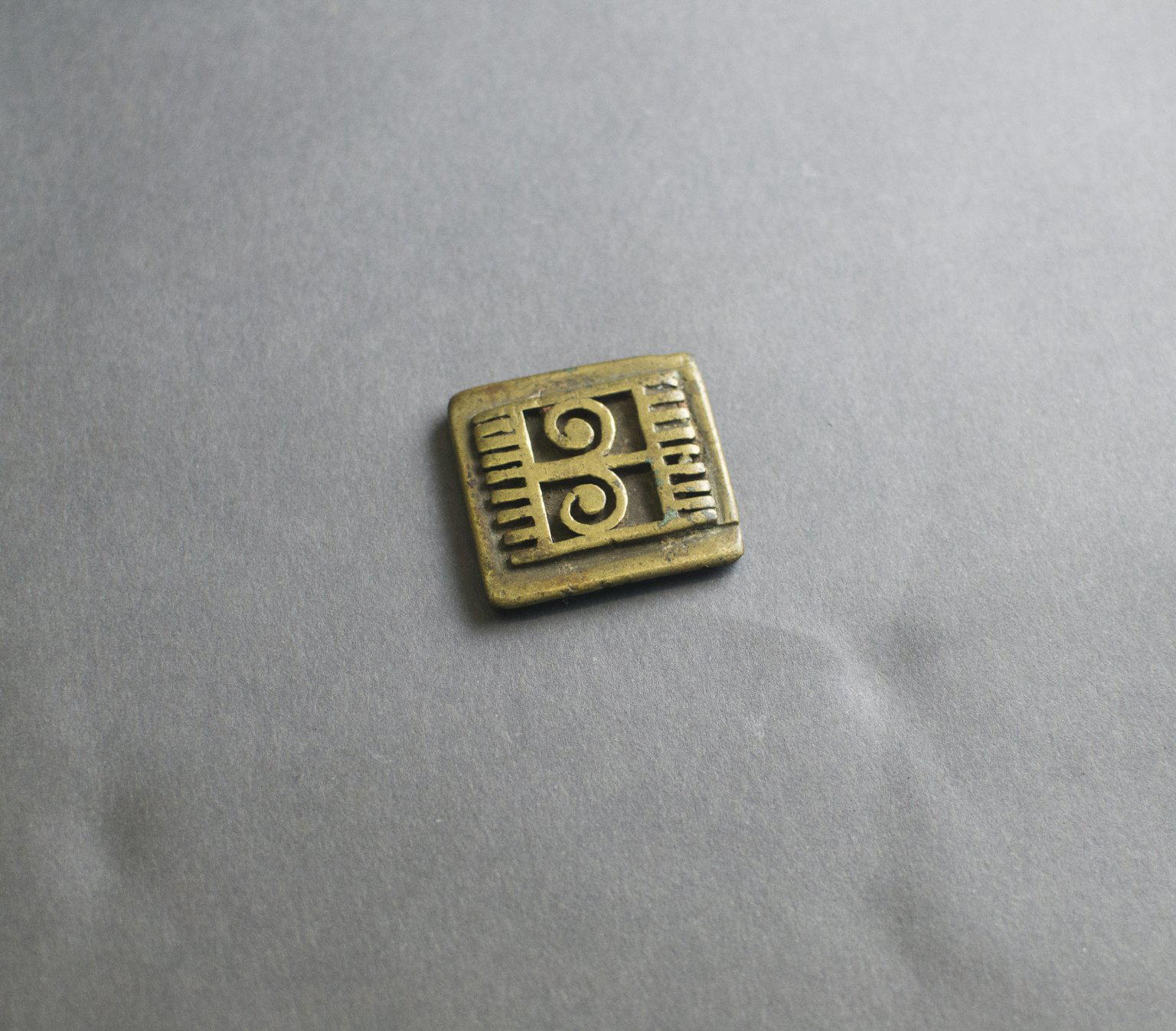 Akan. Gold-dust Box Lid, 19th–20th century. Copper alloy, 1 5/8 x 1 1/2 x 1/8in. (4.1 x 3.8 x 0.3cm) mount: 2 3/4 × 1 1/2 × 1 1/2 in. (7 × 3.8 × 3.8 cm). Brooklyn Museum, Gift of Mr. and Mrs. Franklin H. Williams, 88.192.75. (Photo: Brooklyn Museum)