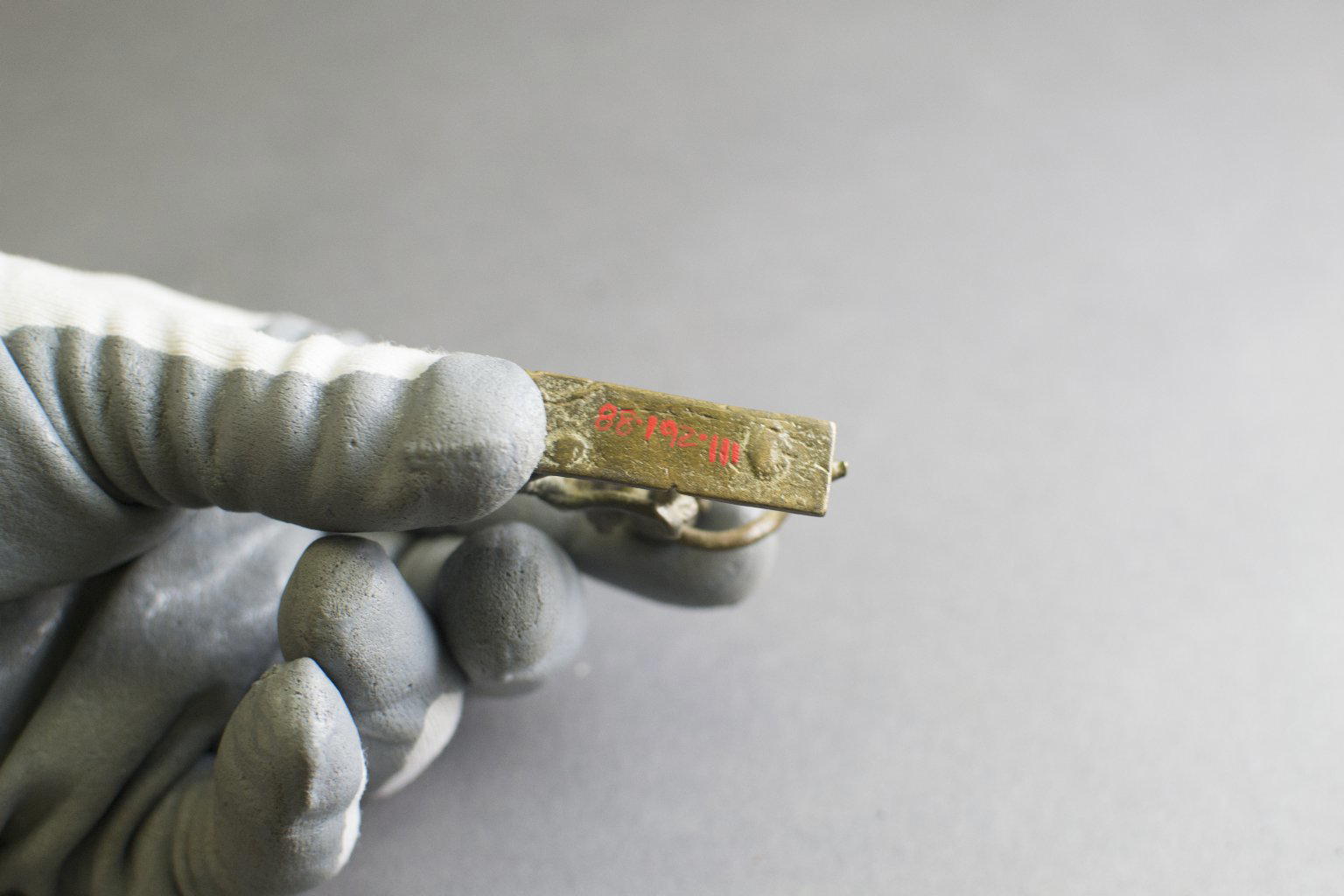 Akan. Gold-weight (abrammuo): male figure, 19th–20th century. Copper alloy, 2 1/4 x 1/2 x 1 3/4 in. Brooklyn Museum, Gift of Mr. and Mrs. Franklin H. Williams, 88.192.111. (Photo: Brooklyn Museum)