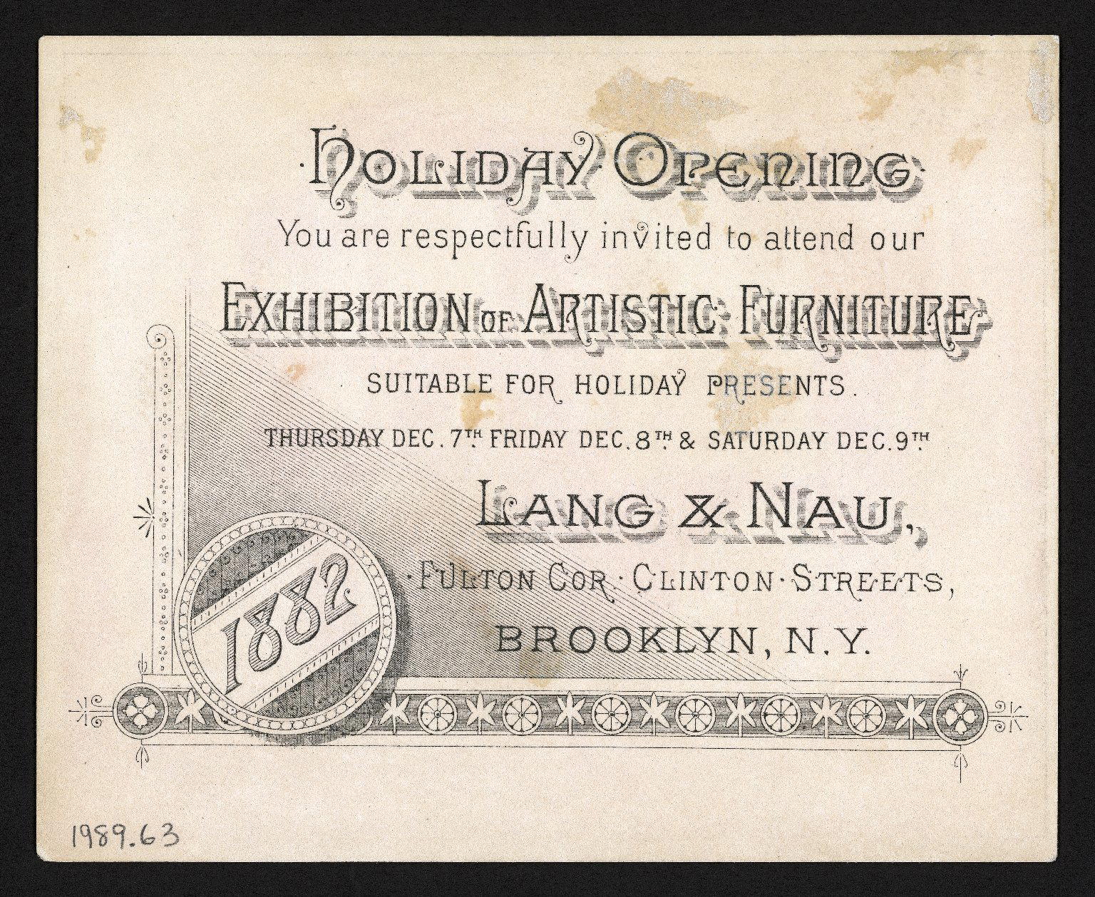Sackett, Wilhelms & Betzig (Active late 19th century). Trade Card for the Firm Lang & Nau, after 1882. Polychromed lithograph, 4 3/8 x 5 3/8 in. (11.1 x 13.7 cm). Brooklyn Museum, Gift of Paul Jeromack, 1989.63. (Photo: Sackett, Wilhelms and Betzig)