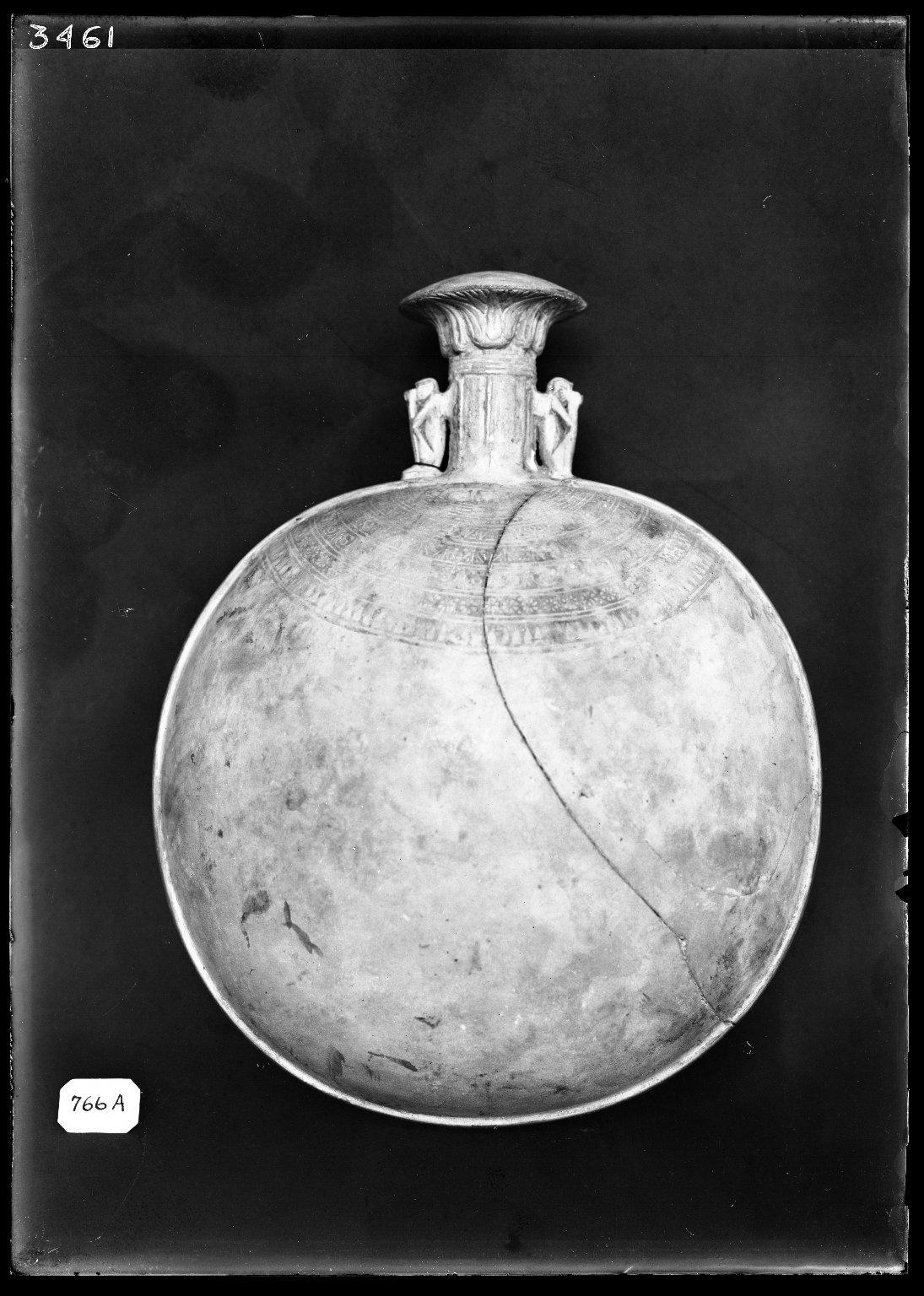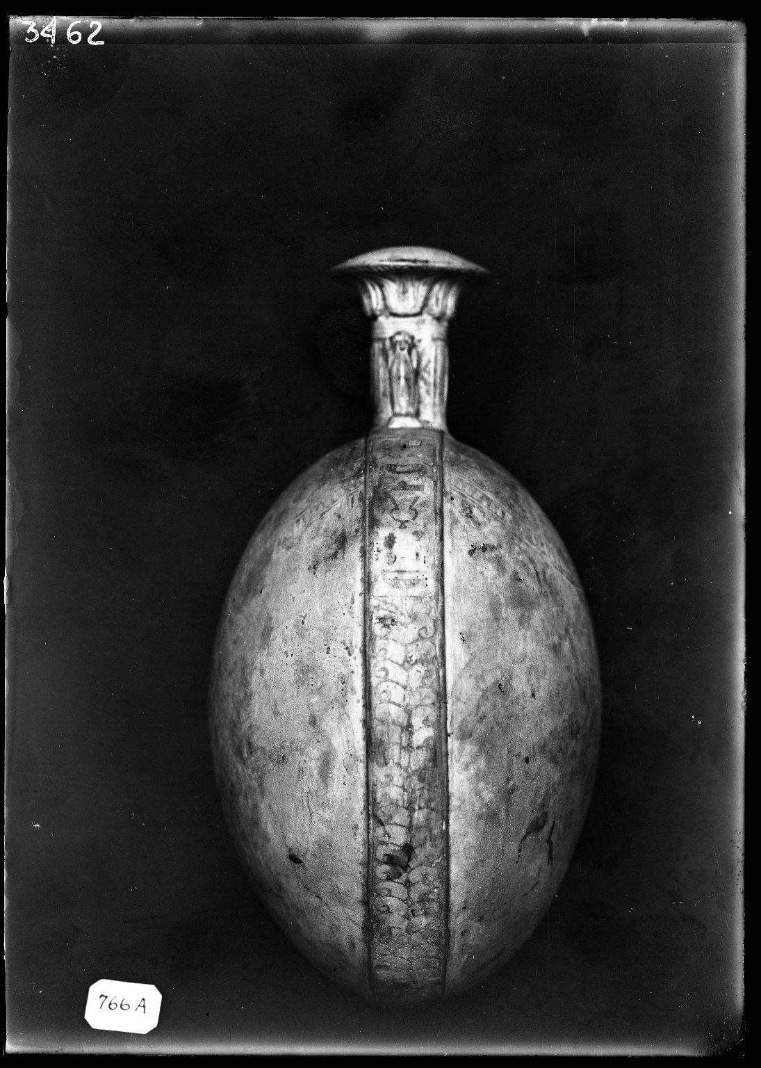 Pilgrim Flask, 664–332 B.C.E.. Faience, 7 7/8 × 6 1/8 × 4 1/16 in. (20 × 15.5 × 10.3 cm). Brooklyn Museum, Charles Edwin Wilbour Fund, 37.336E. (Photo: Brooklyn Museum)