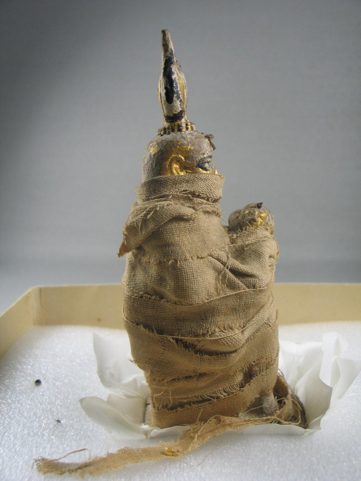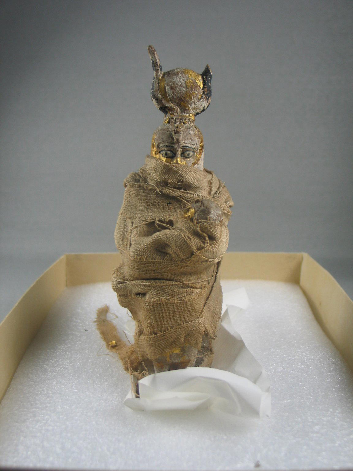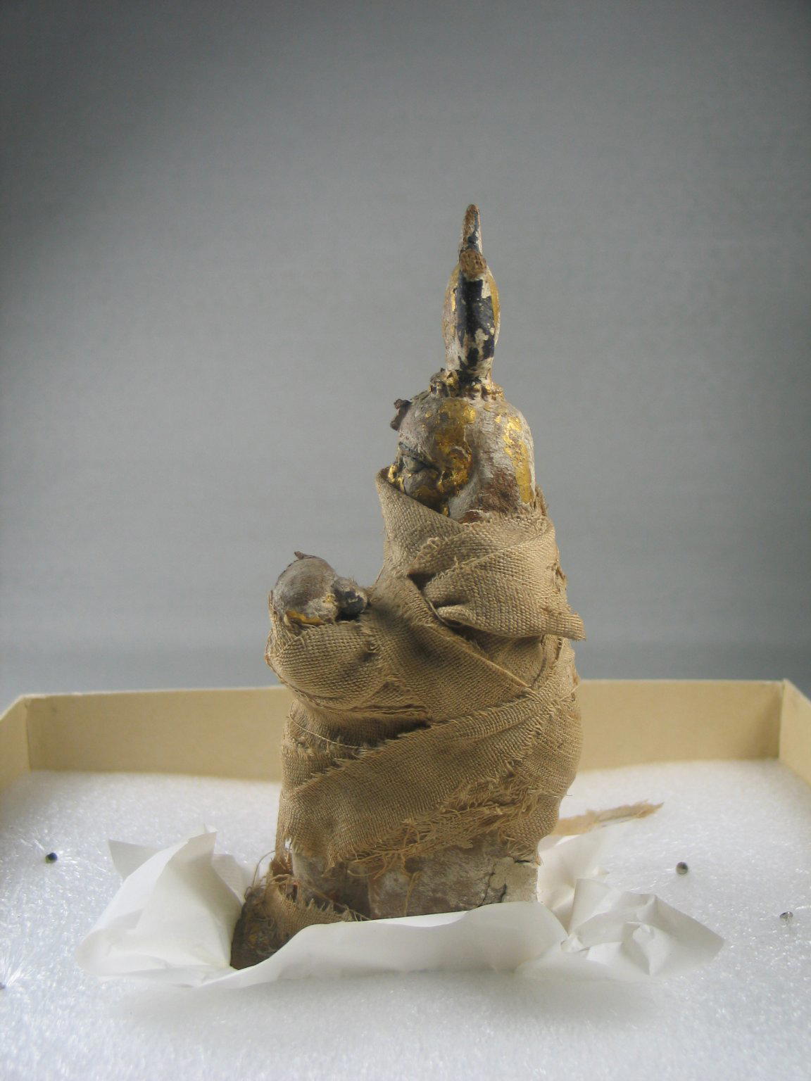 Small Statue of Isis Nursing Horus, 305–30 B.C.E.. Wood, linen, paste, pigment, gold, 6 5/8 x 2 1/16 x 2 11/16 in. (16.9 x 5.3 x 6.8 cm). Brooklyn Museum, Charles Edwin Wilbour Fund, 37.1371E. (Photo: Brooklyn Museum)