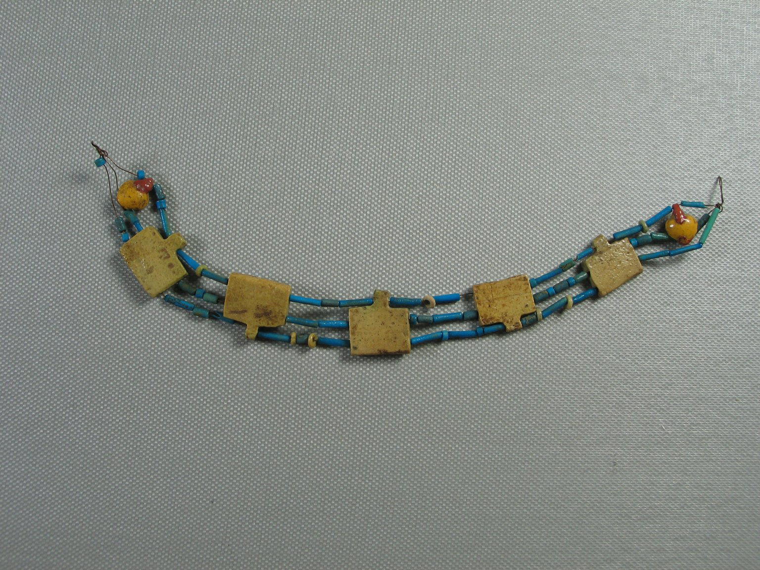 Necklace of Tubular Beads, ca. 1539–1292 B.C.E.. Faience, Total Length: 7 7/8 in. (20 cm) Plaque: 11/16 × 3/16 × 11/16 in. (1.8 × 0.4 × 1.8 cm). Brooklyn Museum, Brooklyn Museum Collection, X249.7. (Photo: Brooklyn Museum)