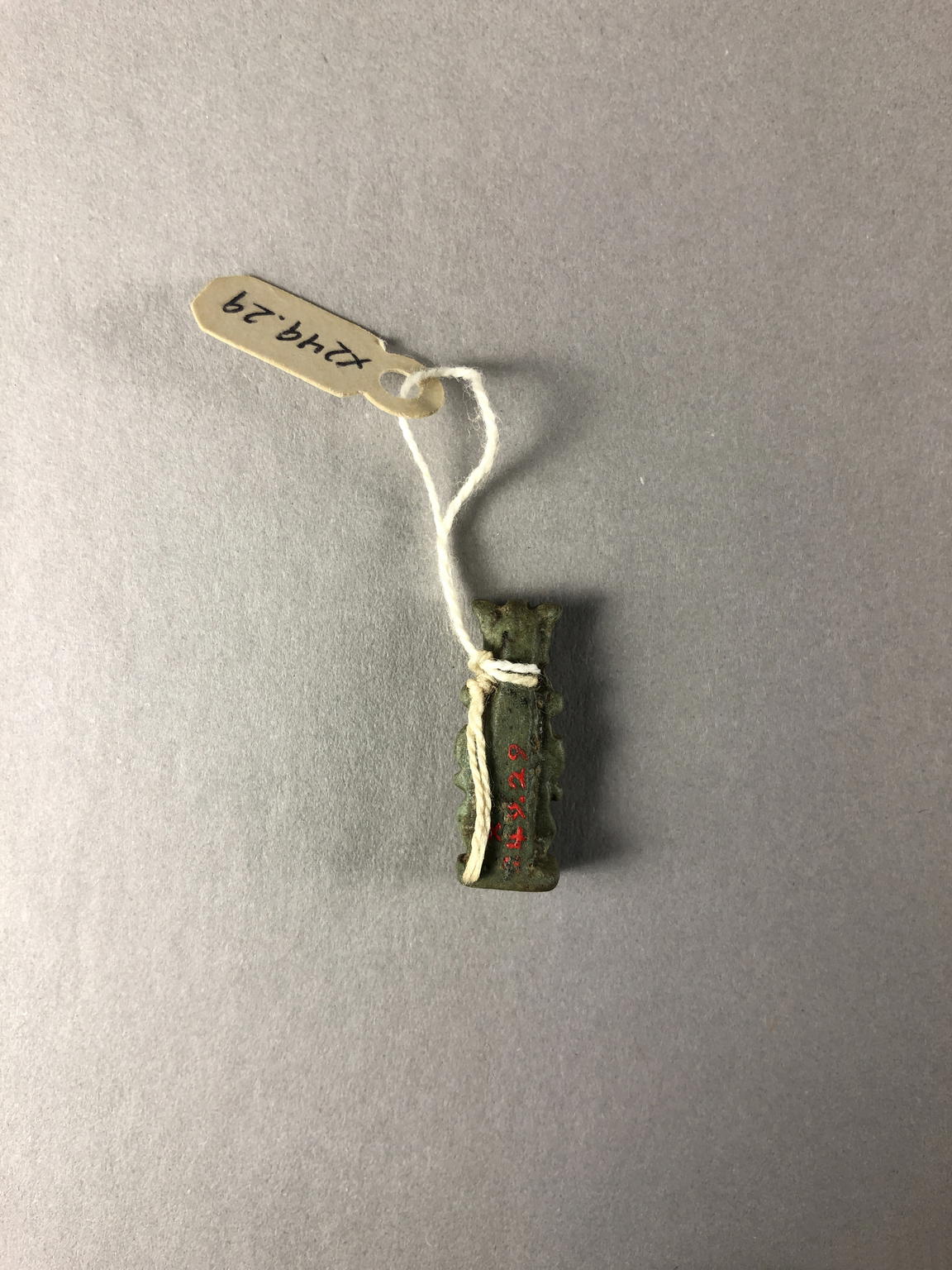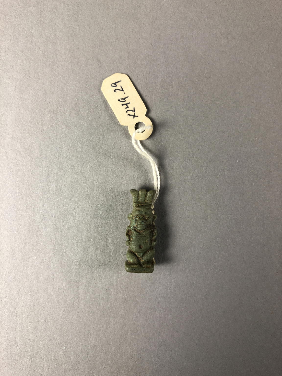 Amulet in the Form of Bes, Faience, 15/16 × 3/8 × 1/4 in. (2.4 × 1 × 0.7 cm). Brooklyn Museum, Brooklyn Museum Collection, X249.29.