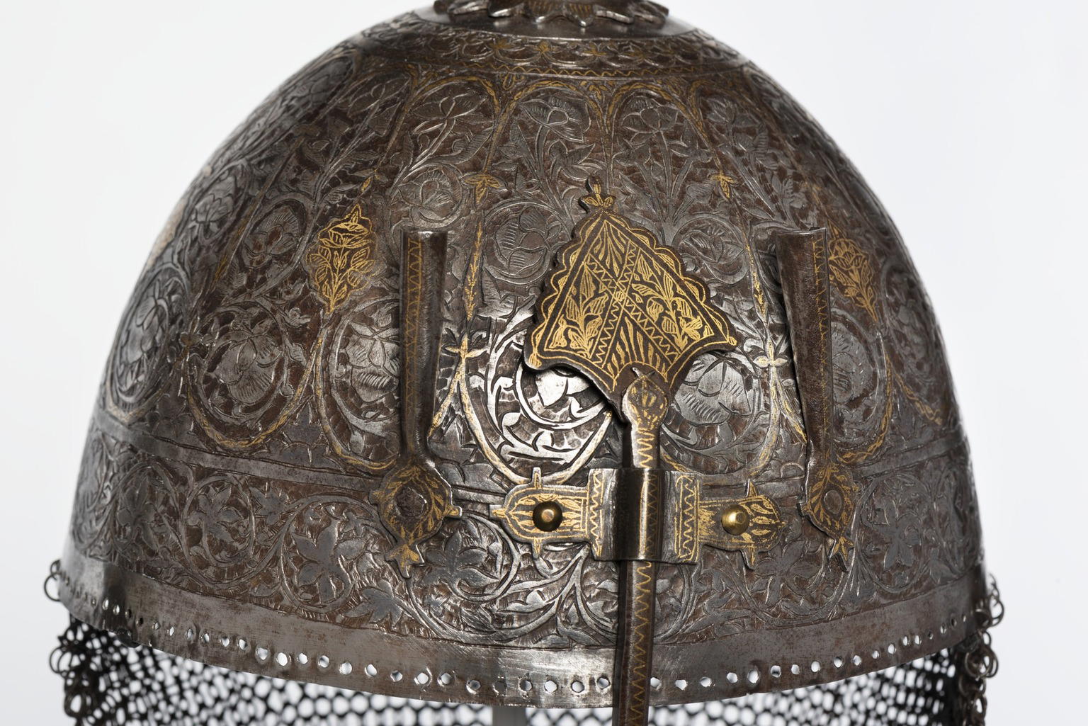 Helmet, 18th century. Steel, engraved and overlaid with gold and silver, 8 1/4 x 21 1/4 in. (21 x 54 cm). Brooklyn Museum, Brooklyn Museum Collection, X635.2. (Photo: Brooklyn Museum)
