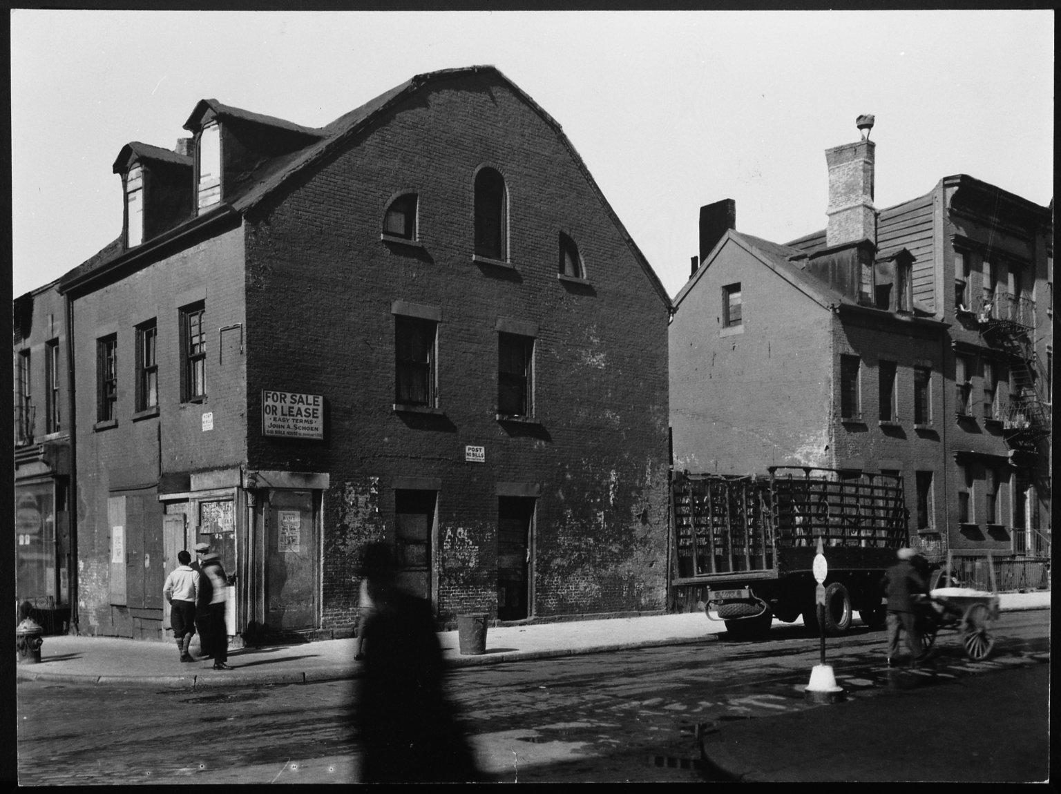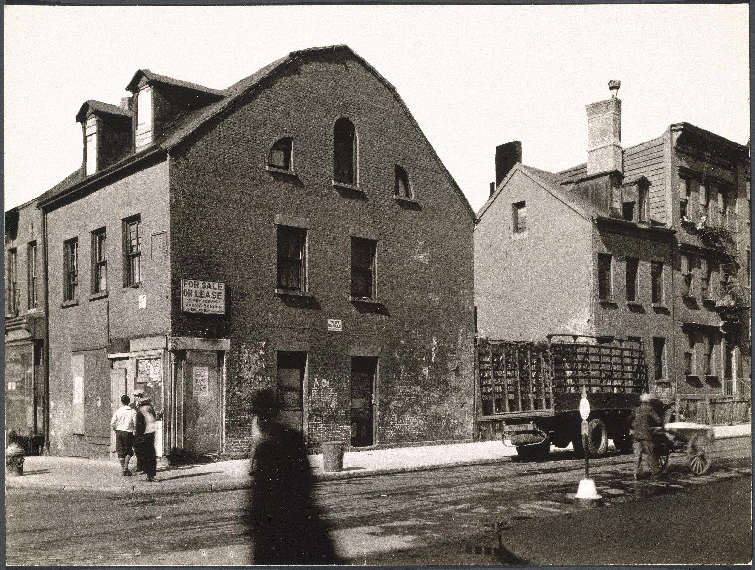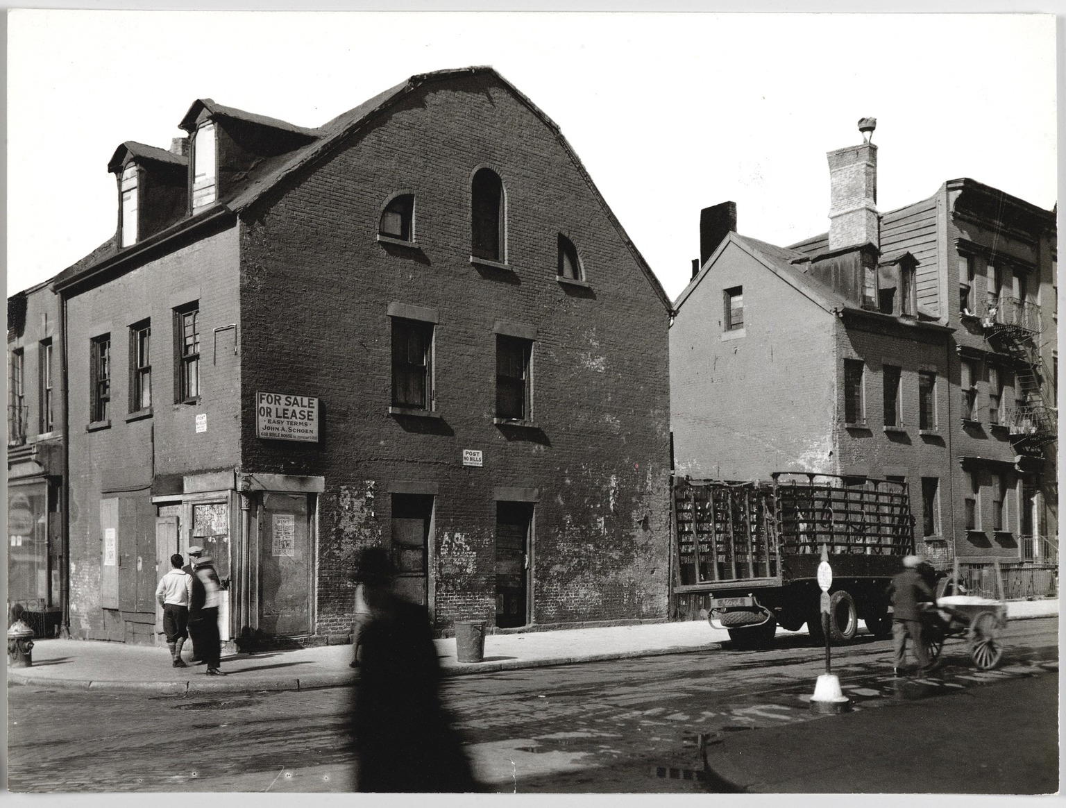 Berenice Abbott (American, 1898–1991). Mulbery and Prince Streets, Manhattan, October 25, 1935. Gelatin silver print, 7 x 9 3/8 in. (17.8 x 23.8 cm). Brooklyn Museum, Brooklyn Museum Collection, X858.3.