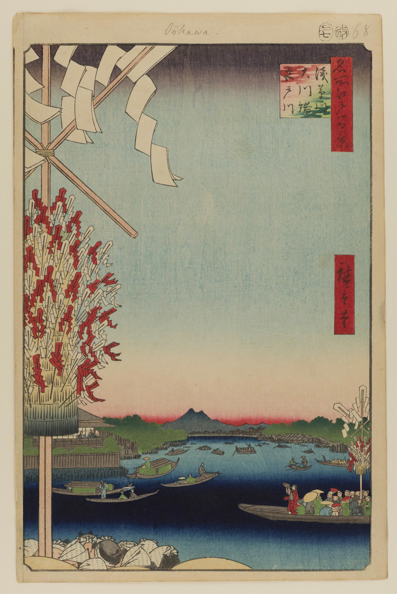 The point of view here is looking north from just under Ryogoku Bridge. Hiroshige provides a characteristically indirect depiction of one of the most interesting summer customs associated with the bridge, the ablutions of the Mount Oyama pilgrims. Instead of showing the spot under the bridge where they rinsed themselves before setting out for the sacred mountain, this view features pilgrims returning from the ablution site. The bonten, or huge assemblages of ritual paper strips dominating the composition, were used by the ascetics who spread the Oyama cult. The title of the print may seem confusing, since Asakusa River, Great Riverbank, and Miyato River all refer to the same river—the Sumida.