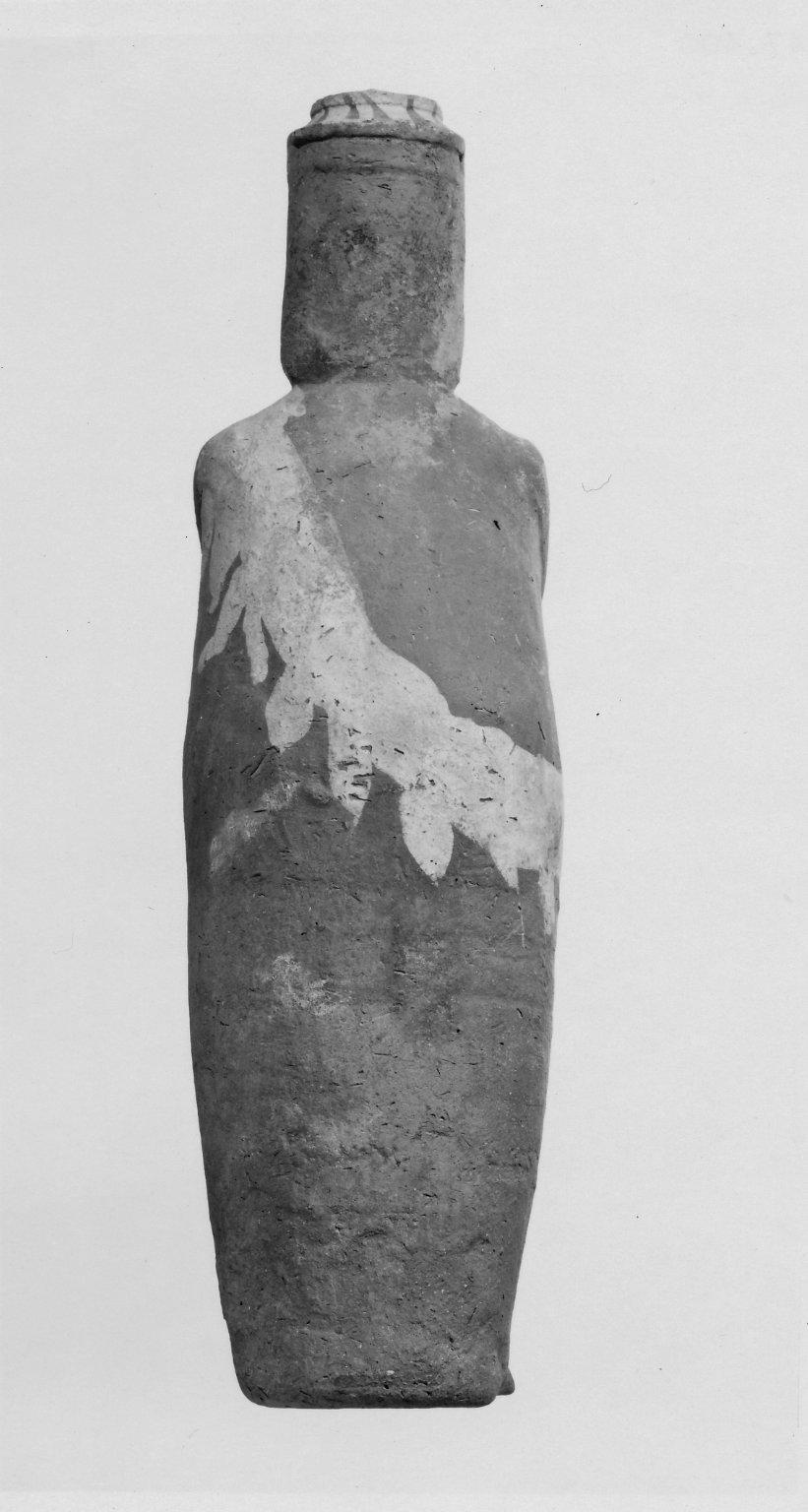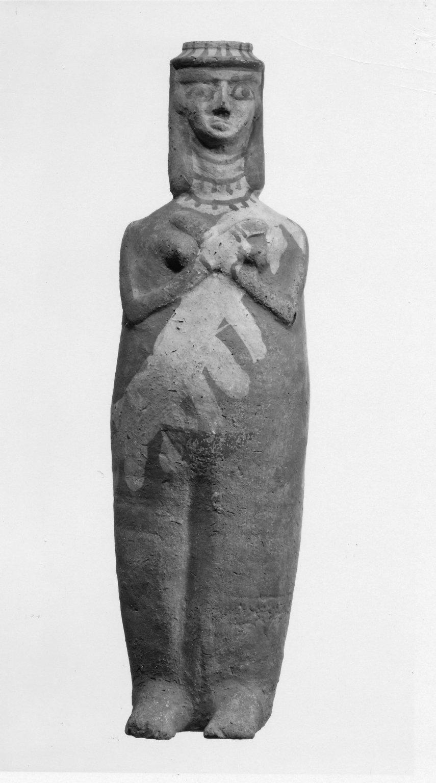 Bottle in Form of Standing Woman, ca. 1539–1190 B.C.E.. Clay, pigment, 12 5/16 x Diam. 3 11/16 in. (31.2 x 9.3 cm). Brooklyn Museum, Charles Edwin Wilbour Fund, 07.447.400. (Photo: Brooklyn Museum)