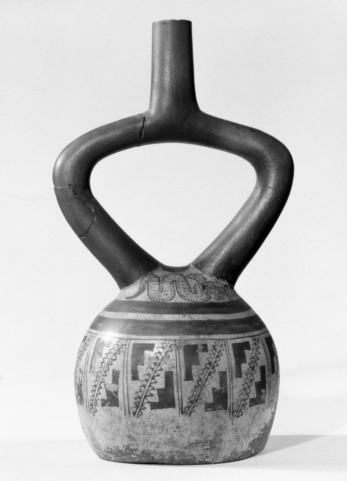 Moche. Stirrup-spout Vessel, 200–700 C.E.. Ceramic, bichrome slip, 9 13/16 x 5 1/2 in. (24.9 x 14 cm). Brooklyn Museum, Gift of the Ernest Erickson Foundation, Inc., 86.224.46. (Photo: Brooklyn Museum)