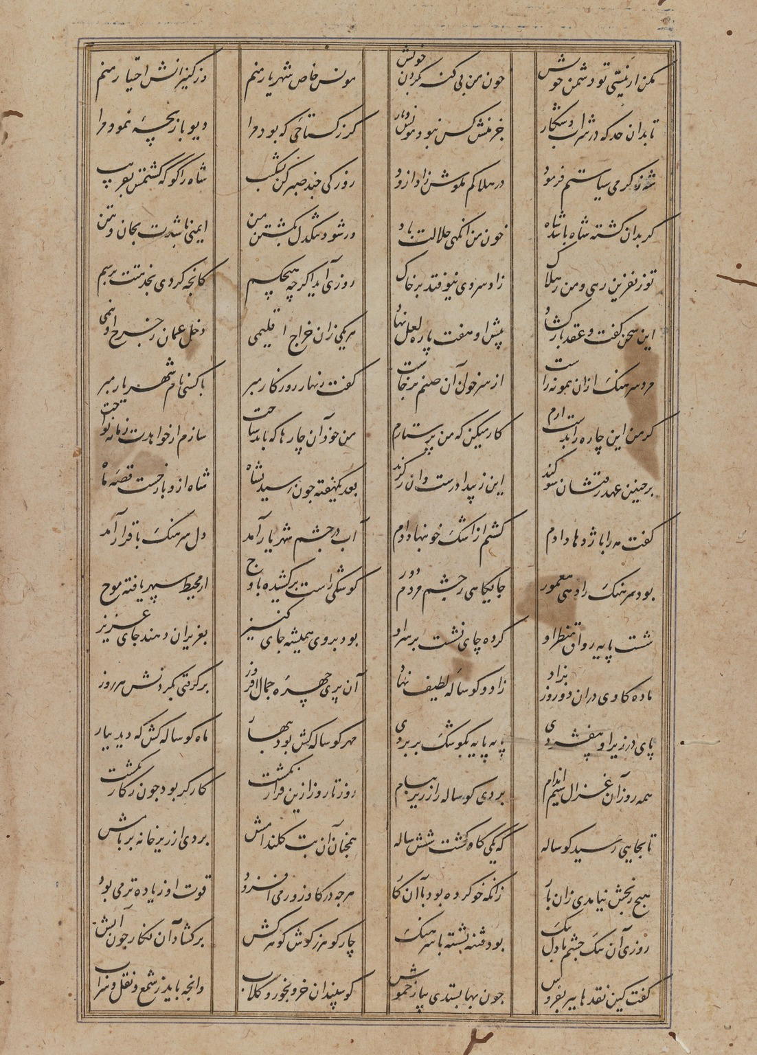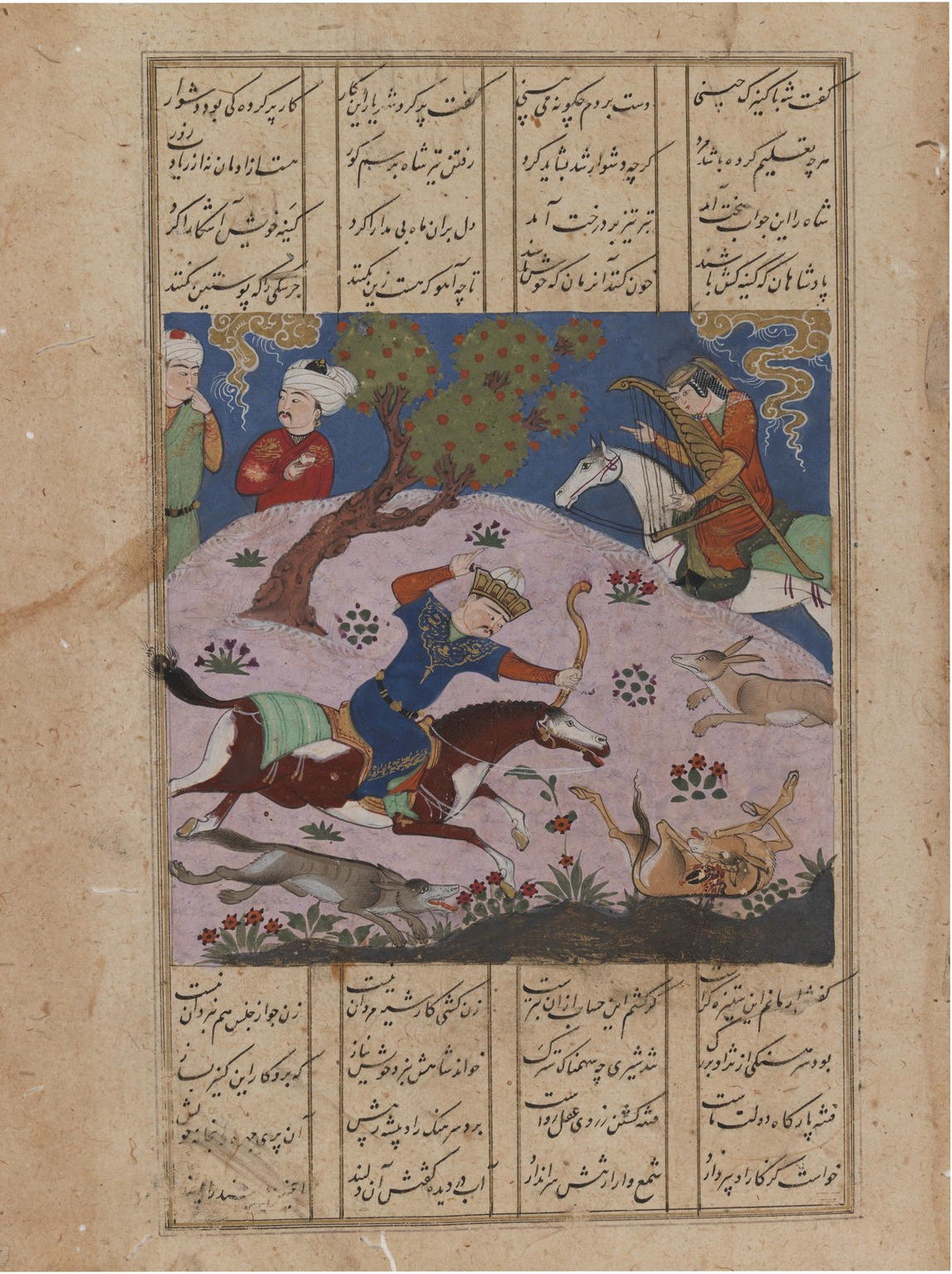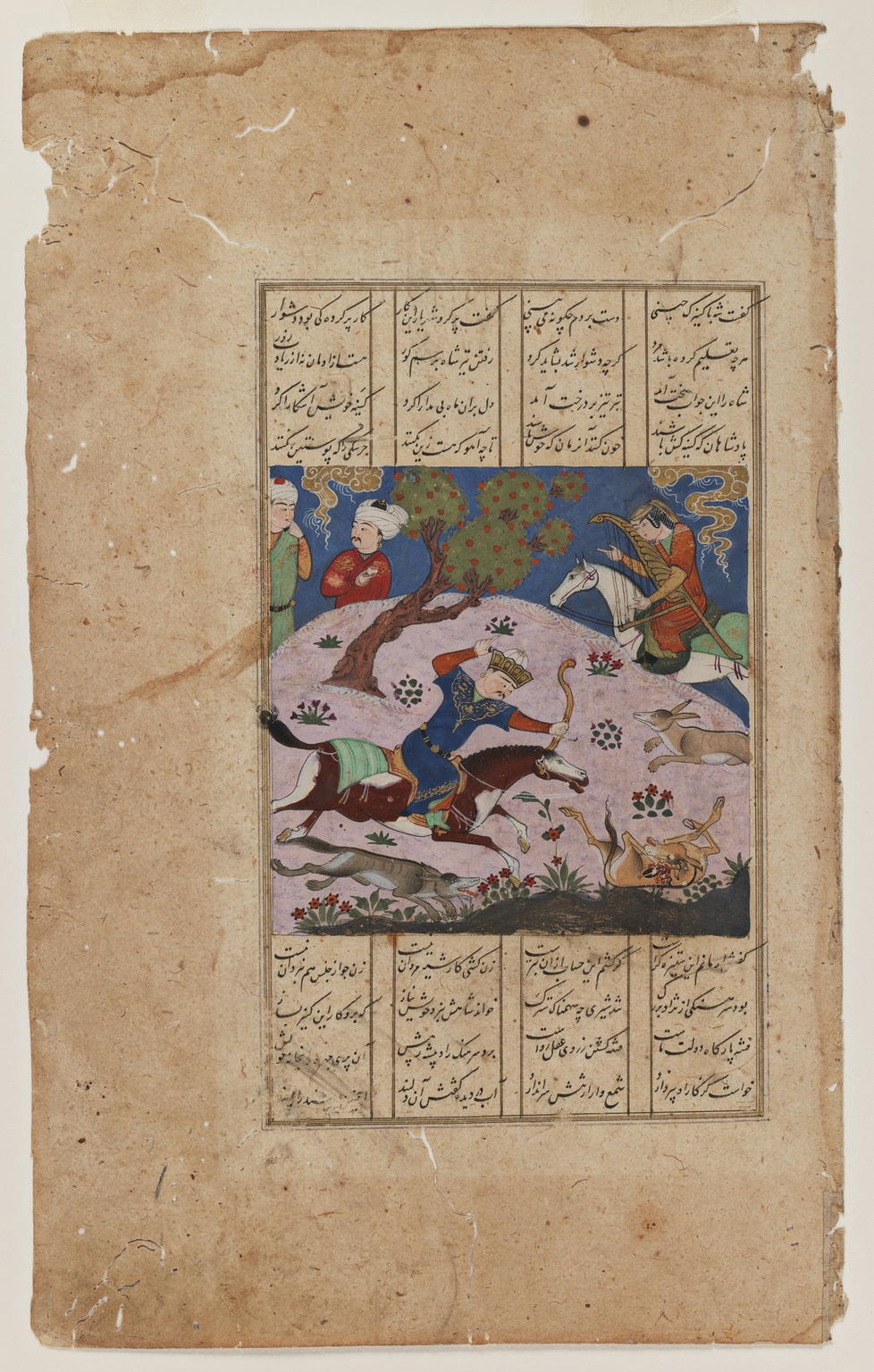 Nizami. Bahram Gur Hunting Onagers with Fitna, Page from the Haft paykar (Seven Portraits), from a manuscript of the Khamsa (Quintet) of Nizami (d. 1209), 1495. Opaque watercolor, ink, silver, and gold on paper, 4 x 4 1/16 in. (10.2 x 10.3 cm). Brooklyn Museum, Gift of the Ernest Erickson Foundation, Inc., 86.227.129.1a-b. (Photo: Brooklyn Museum)