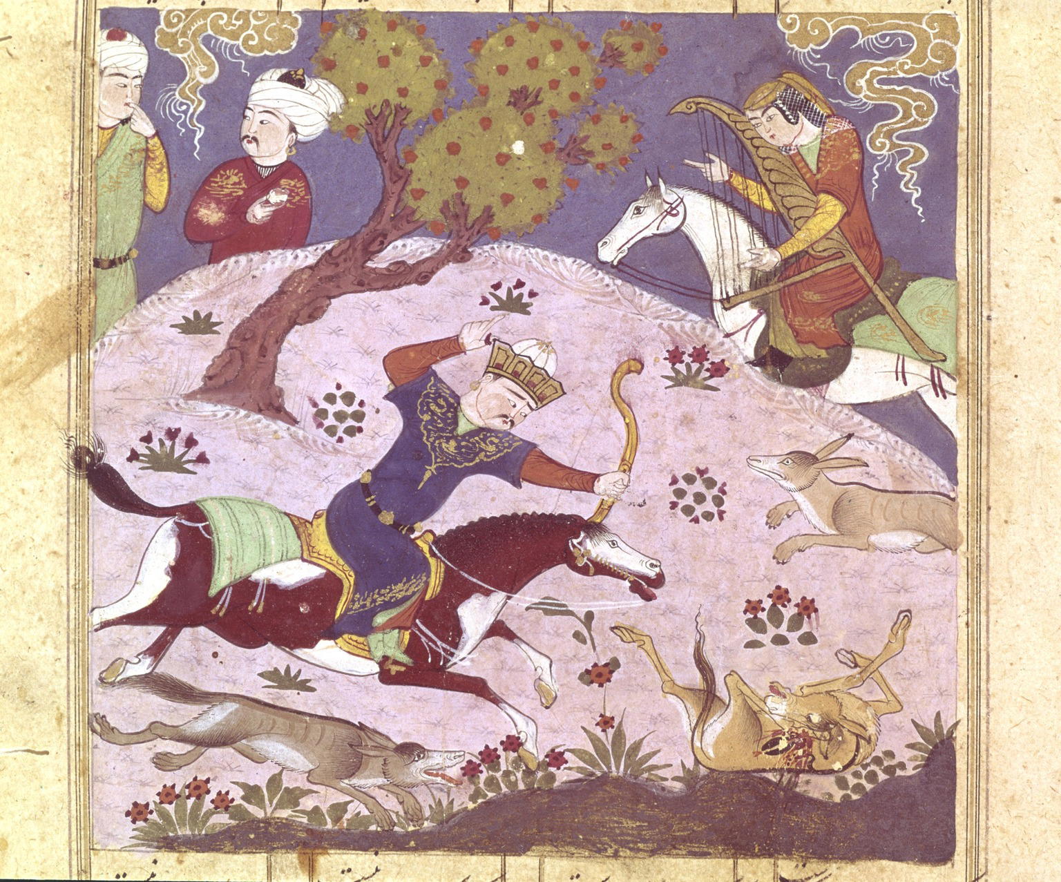 Bahram Gur Hunting Onagers with Fitna, Page from the Haft paykar (Seven Portraits), from a manuscript of the Khamsa (Quintet) of Nizami (d. 1209)