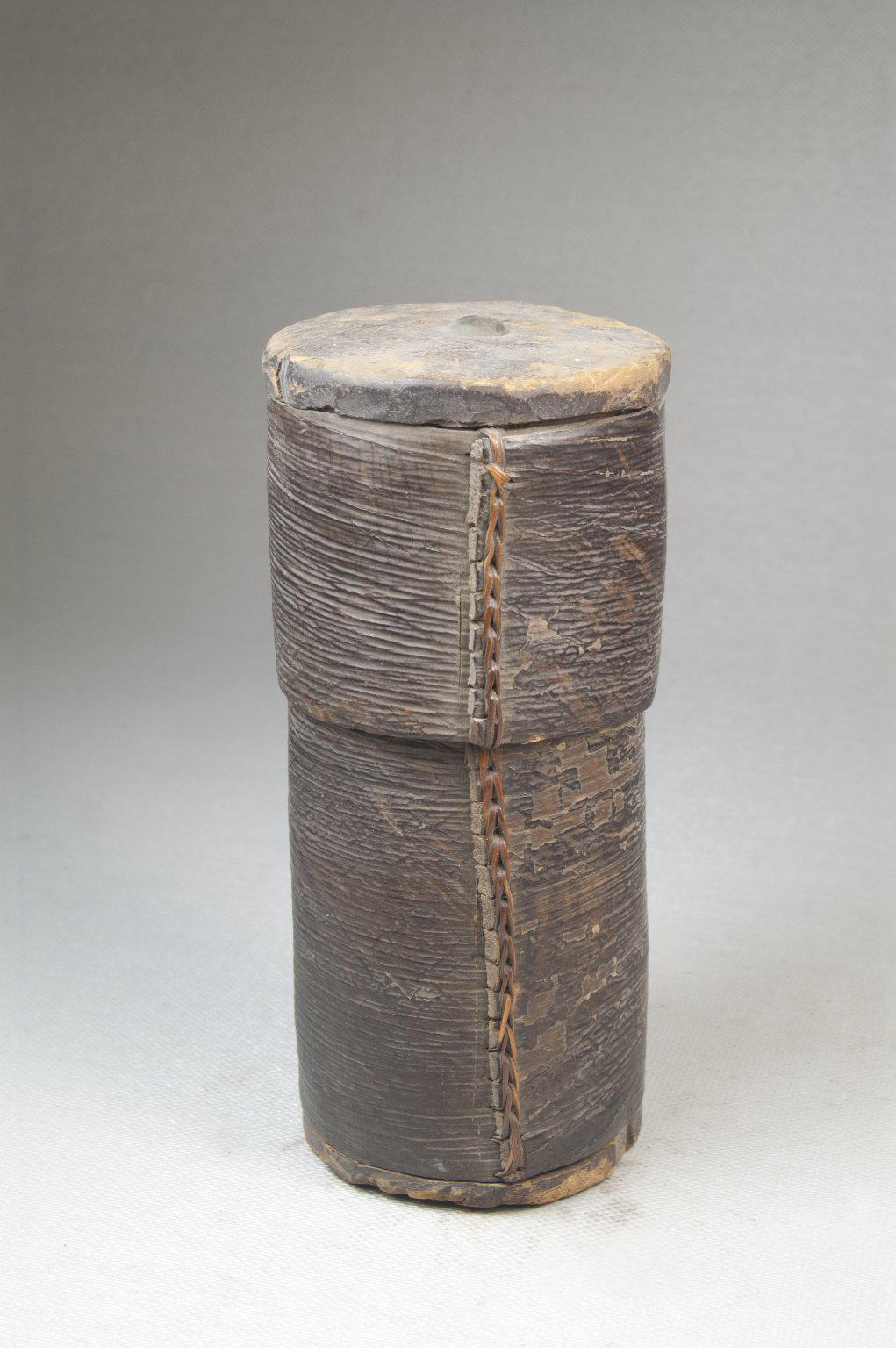 Kuba ?. Cylindrical Box with Cover, Bark, wood, fiber, pigment, upholstery stud, 5 1/8 x 2 3/8 in. (13 x 6 cm). Brooklyn Museum, Museum Expedition 1922, Robert B. Woodward Memorial Fund, 22.132a-b. (Photo: Brooklyn Museum)