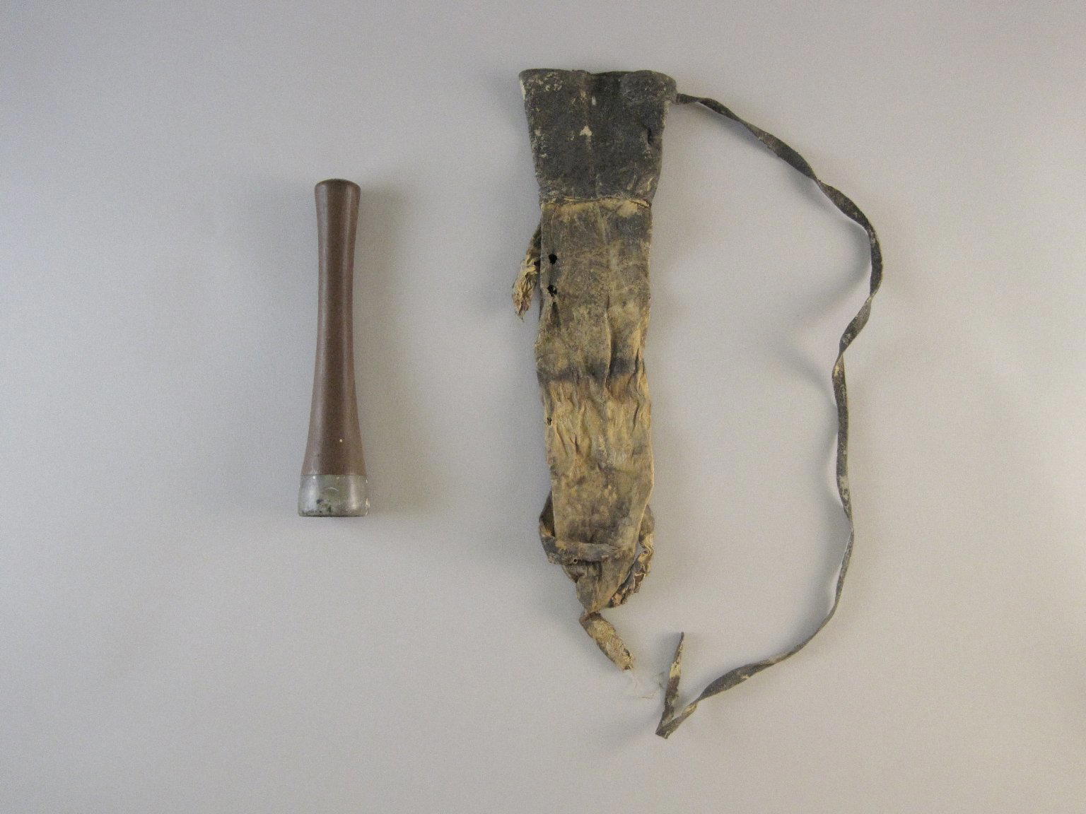 Yurok. Tobacco Pipe and Pouch, Soap stone, wood, 1 × 1 × 5 1/8 in. (2.5 × 2.5 × 13 cm). Brooklyn Museum, Museum Expedition 1905, Museum Collection Fund, 05.588.7551a-b. (Photo: Brooklyn Museum)
