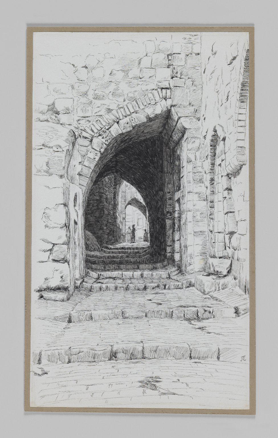 James Tissot (Nantes, France, 1836–1902, Chenecey–Buillon, France). A Street in Jerusalem, 1886–1887 or 1889. Pen and ink on paper mounted on board, Sheet: 8 1/2 x 4 7/8 in. (21.6 x 12.4 cm) Mount: 8 11/16 x 5 3/16 in. (22.1 x 13.2 cm). Brooklyn Museum, Purchased by public subscription, 00.159.375. (Photo: Brooklyn Museum)