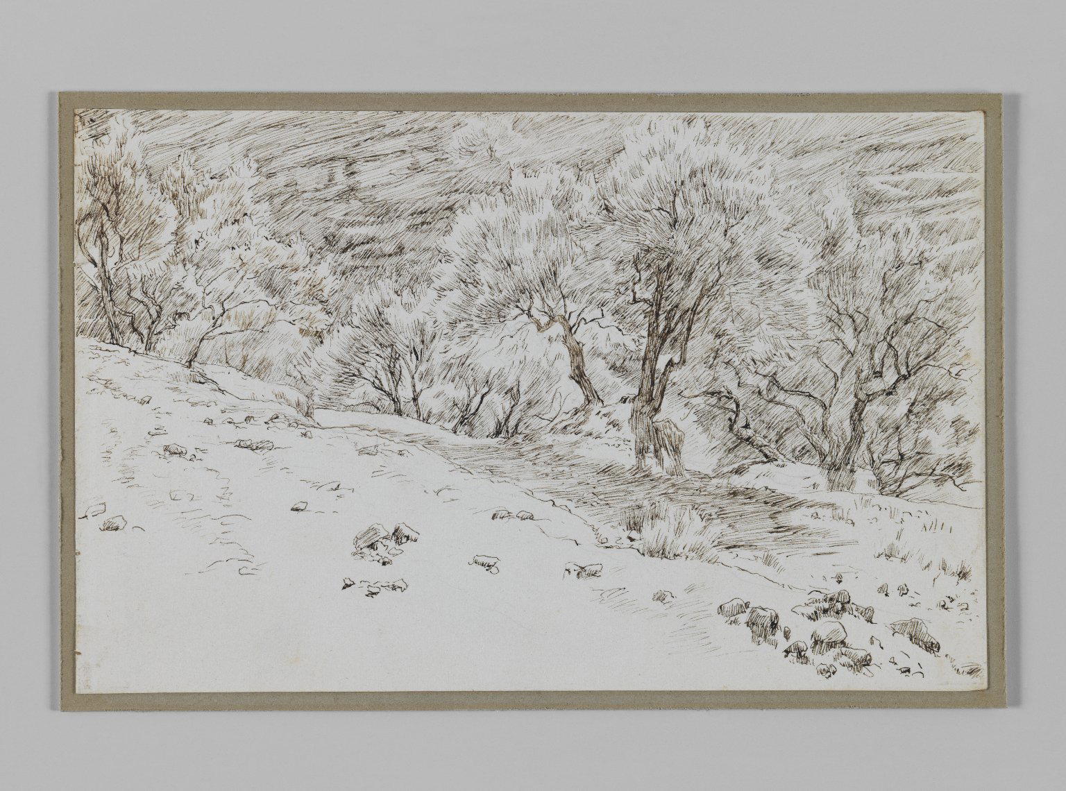 James Tissot (Nantes, France, 1836–1902, Chenecey–Buillon, France). Olive Trees, Valley of Hinnom (Oliviers, vallée de Hinon), 1886–1887 or 1889. Pen and ink on paper mounted on board, Sheet: 4 11/16 x 7 5/16 in. (11.9 x 18.6 cm) Mount: 5 x 7 5/8 in. (12.7 x 19.4 cm). Brooklyn Museum, Purchased by public subscription, 00.159.385. (Photo: Brooklyn Museum)
