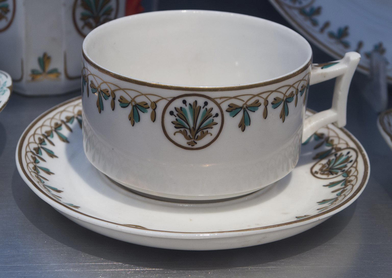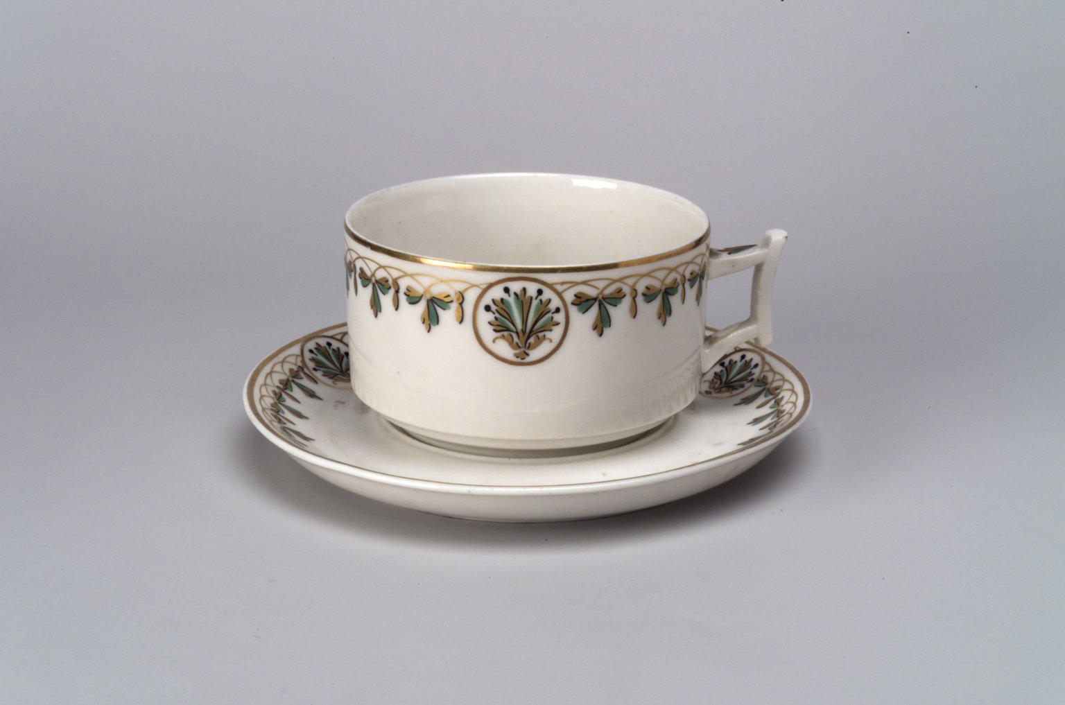 Union Porcelain Works (1863–ca. 1922). Large Cup and Saucer, ca. 1880. Porcelain, (a) Cup: 2 1/8 x 4 5/8 x 3 3/4 in. (5.4 x 11.7 x 9.5 cm) (b) Saucer: 5/8 x 5 7/8 x 5 7/8 in. (1.6 x 14.9 x 14.9 cm). Brooklyn Museum, Gift of Franklin Chace, 68.87.10a-b. (Photo: Brooklyn Museum)