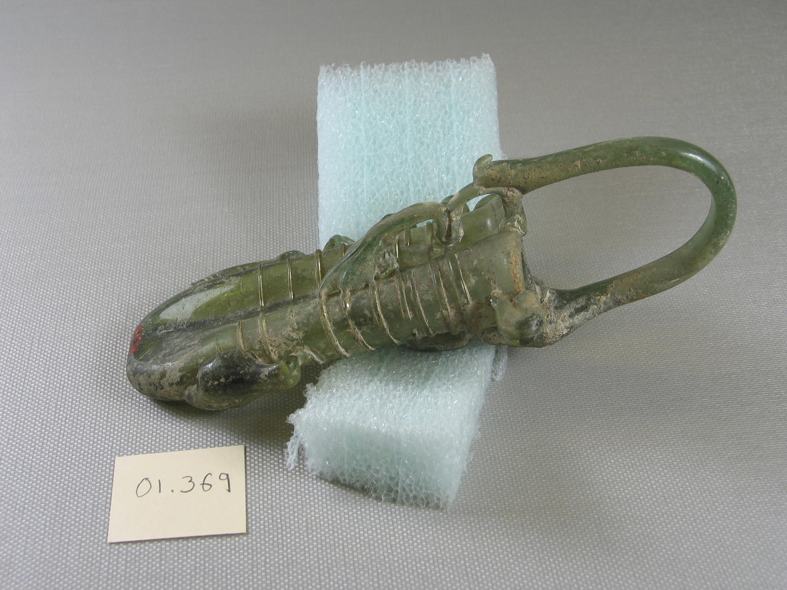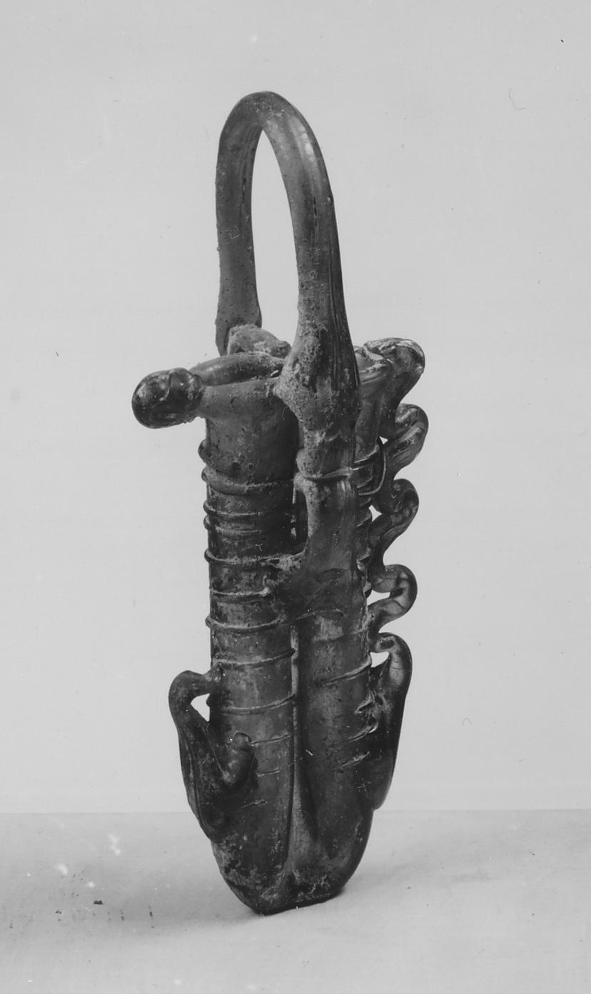 Roman. Double Cosmetic Tube with Basket Handle, 4th–6th century C.E.. Glass, 6 9/16 x greatest width 2 7/16 in. (16.7 x 6.2 cm). Brooklyn Museum, Gift of Robert B. Woodward, 01.369. (Photo: Brooklyn Museum)