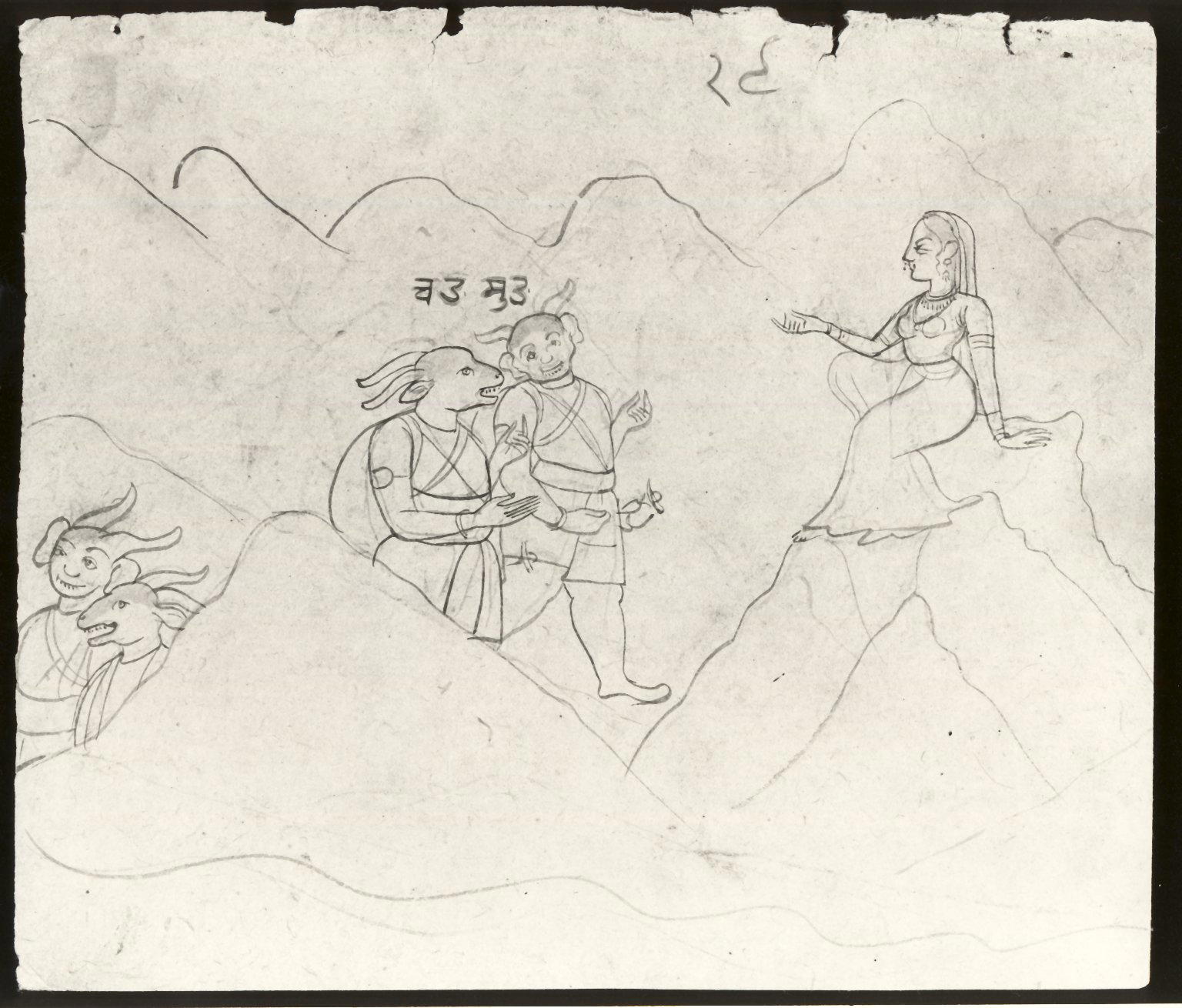 Indian. Canda and Munda before Parvati, ca. 1760. Ink on paper, sheet: 6 1/2 x 7 1/2 in. (16.4 x 19.0 cm). Brooklyn Museum, Anonymous gift, 1991.128.4. (Photo: Brooklyn Museum)