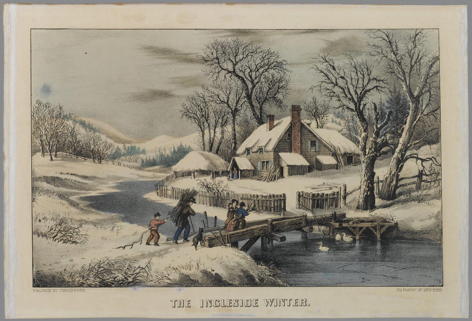 Inscribed, below plate, lower left, printed: "PUBLISHED BY CURRIER & IVES"; below plate, lower center, printed: "THE INGLESIDE WINTER."; below plate, lower right, printed: "152 NASSAU ST. NEW YORK.".