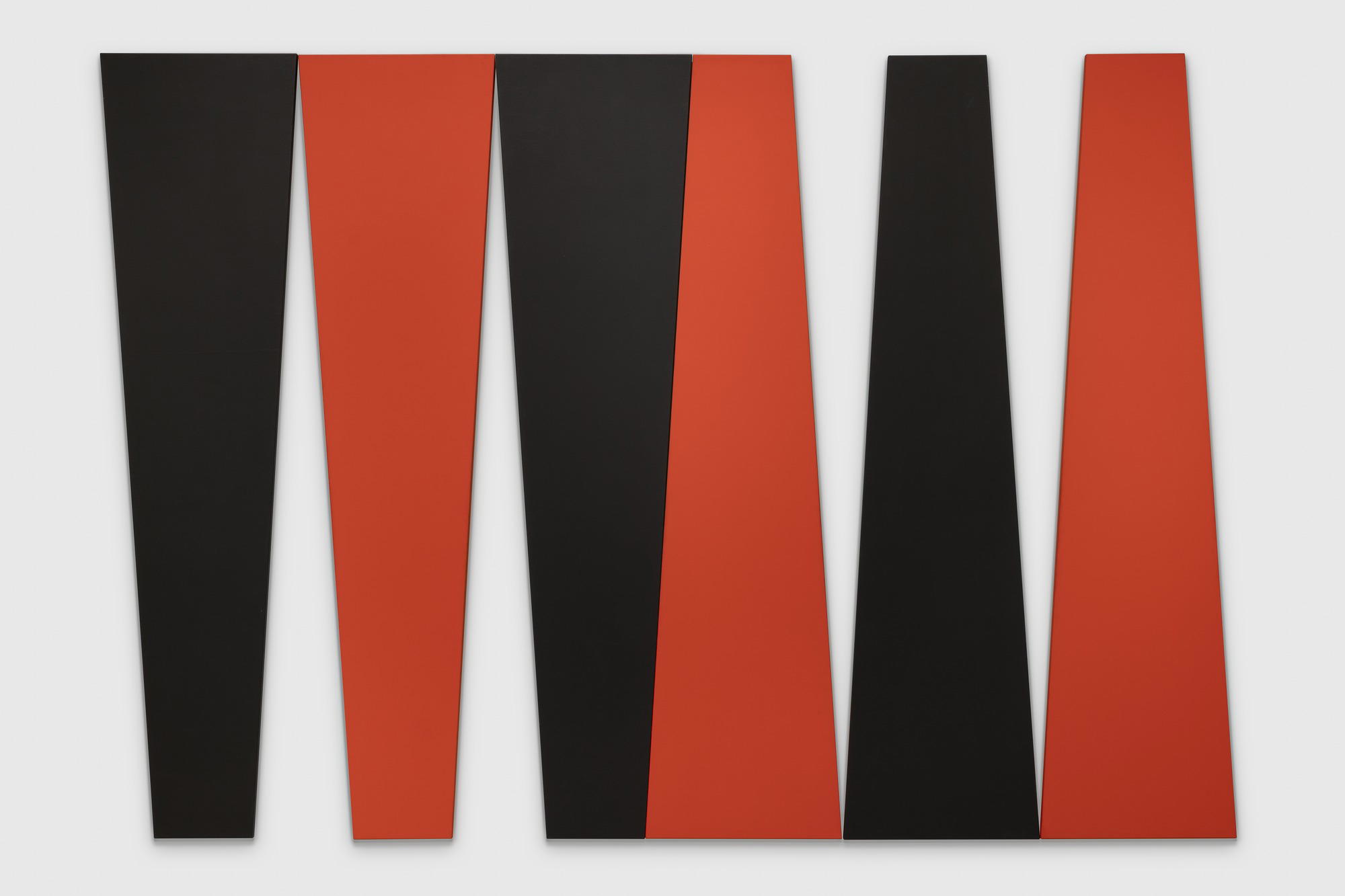 Leon Polk Smith (American, 1906–1996). Arrangement in Black and Red, 1980. Acrylic on canvas, 6 parts, overall: 120 x 180in. (304.8 x 457.2cm) 6 parts, as displayed 2019: 120 × 175 in. (304.8 × 444.5 cm). Brooklyn Museum, Bequest of Leon Polk Smith, 2011.12.8a-f. © Leon Polk Smith Foundation. (Photo: Brooklyn Museum)