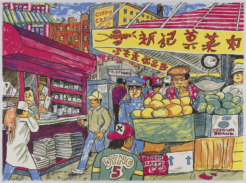 Red Grooms (American, born 1937). Corner of Canal, 1993. Color lithograph on BFK Rives paper, 30 x 22 1/4 in. (76.3 x 56.5 cm). Brooklyn Museum, Gift of the Community Committee of the Brooklyn Museum, 1993.124. (Photo: Brooklyn Museum)
