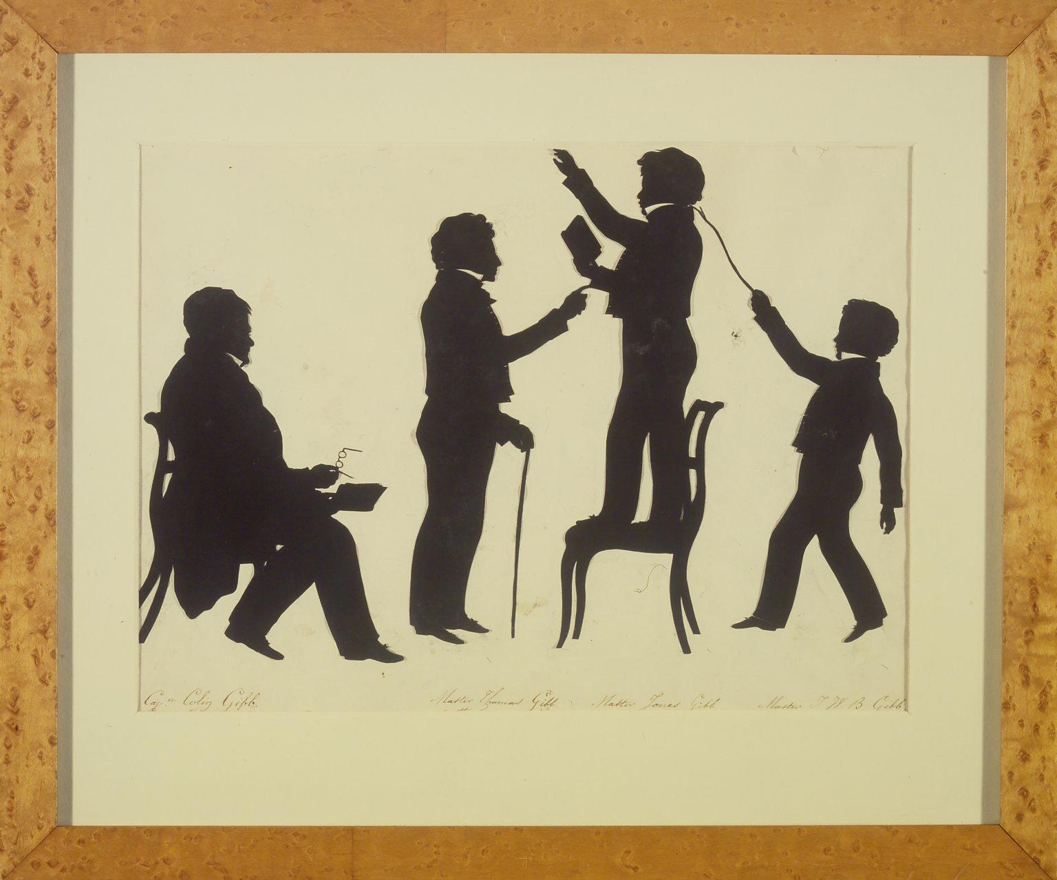 August Edouart (French, 1789–1861). Cut Silhouette of Four Full Figures, ca. 1830. Paper, wood frame with gilt trim, framed size: 15 x 18 in. (38.1 x 45.7 cm). Brooklyn Museum, Gift of the Estate of Emily Winthrop Miles, 64.195.93. (Photo: Brooklyn Museum)