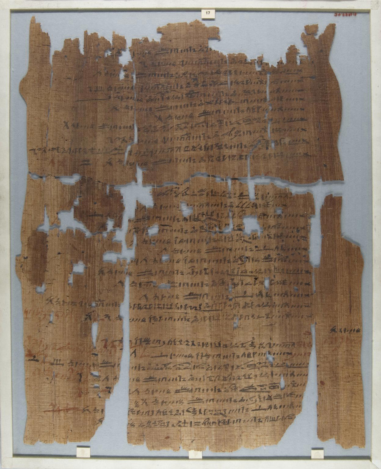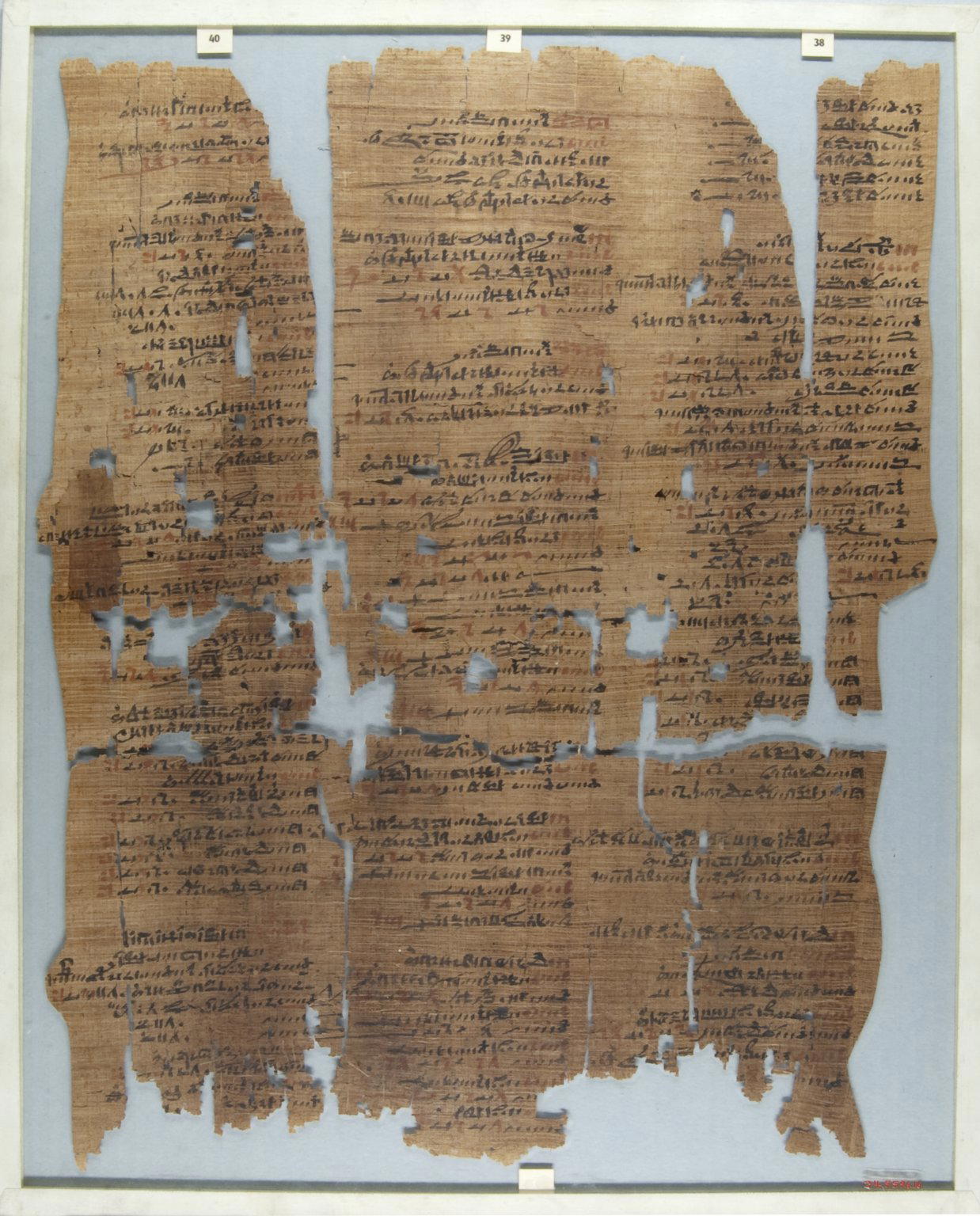 The Wilbour Papyrus, ca. 1147 B.C.E.. Papyrus, ink, Glass: 14 9/16 x 18 1/8 in. (37 x 46 cm) Object: 13 3/16 x 16 9/16 in. (33.5 x 42 cm) Total length of 34.5596.1-.33: 406 11/16 in. (10.33 m). Brooklyn Museum, Charles Edwin Wilbour Fund, 34.5596.16. (Photo: Brooklyn Museum)