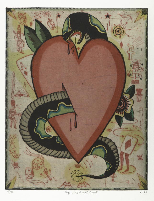 Tony Fitzpatrick (American, 1958–2025). My Snakebit Heart, 1993. Color etching with chine colle, Sheet: 17 3/8 x 14 7/8 in. (44.2 x 37.8 cm) Image: 10 7/8 x 8 7/16 in. (27.6 x 21.4 cm). Brooklyn Museum, Alfred T. White Fund, 1996.190. © Tony Fitzpatrick. (Photo: Brooklyn Museum)