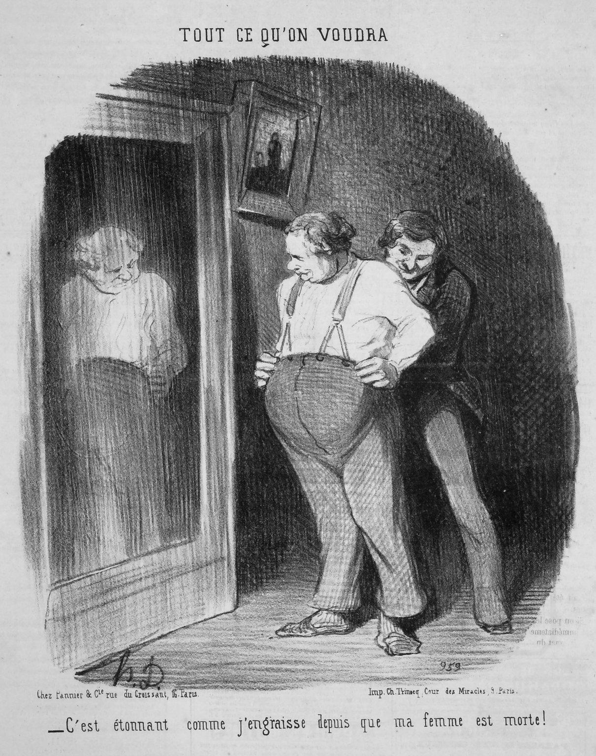 Top center above image: "TOUT CE QU'ON VOUDRA"; lower right in block: "959"; lower left below image: "Chez Pannier & Cie. rue du Croissant, 16. Paris"; lower right below image: "Imp. Ch. Trinocq, Cour des Miracles, 9. Paris"; lower center below image: "- C'est étonnant comme j'engraisse depuis que ma femme est morte!"
