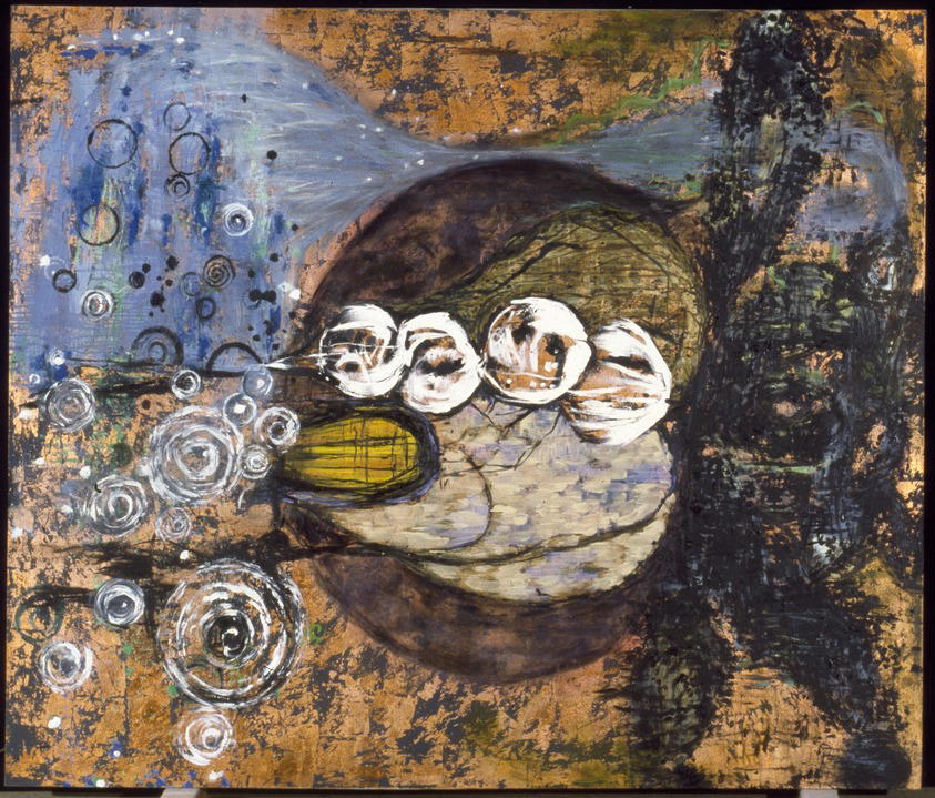 Janis Provisor (American, born 1946). El Jebel, 1987. Oil, metallic powders and metal leaf on canvas, 92 1/4 × 78 × 2 1/4 in. (234.3 × 198.1 × 5.7 cm). Brooklyn Museum, Gift of Brad Davis, 1997.34. (Photo: Brooklyn Museum)