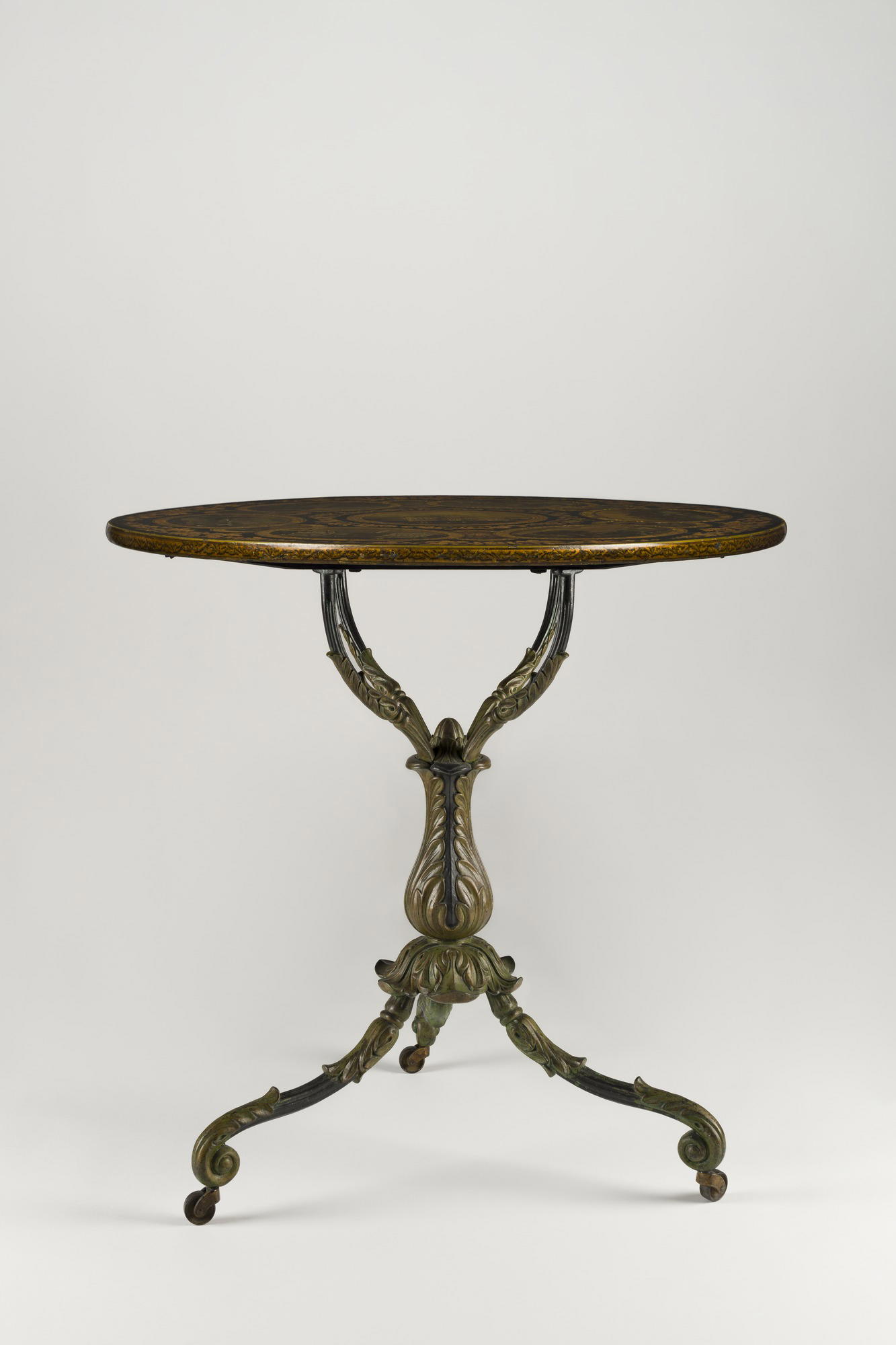 (of tabletop) Unknown Maker; (of base) attributed to Noyes & Hutton (1847–1852). Table, ca. 1840–1855. Cast iron, wood, and painted decoration, 28 3/8 x 28 3/8 x 28 3/8 in. (72.1 x 72.1 x 72.1 cm). Brooklyn Museum, H. Randolph Lever Fund, 78.131. (Photo: Brooklyn Museum)