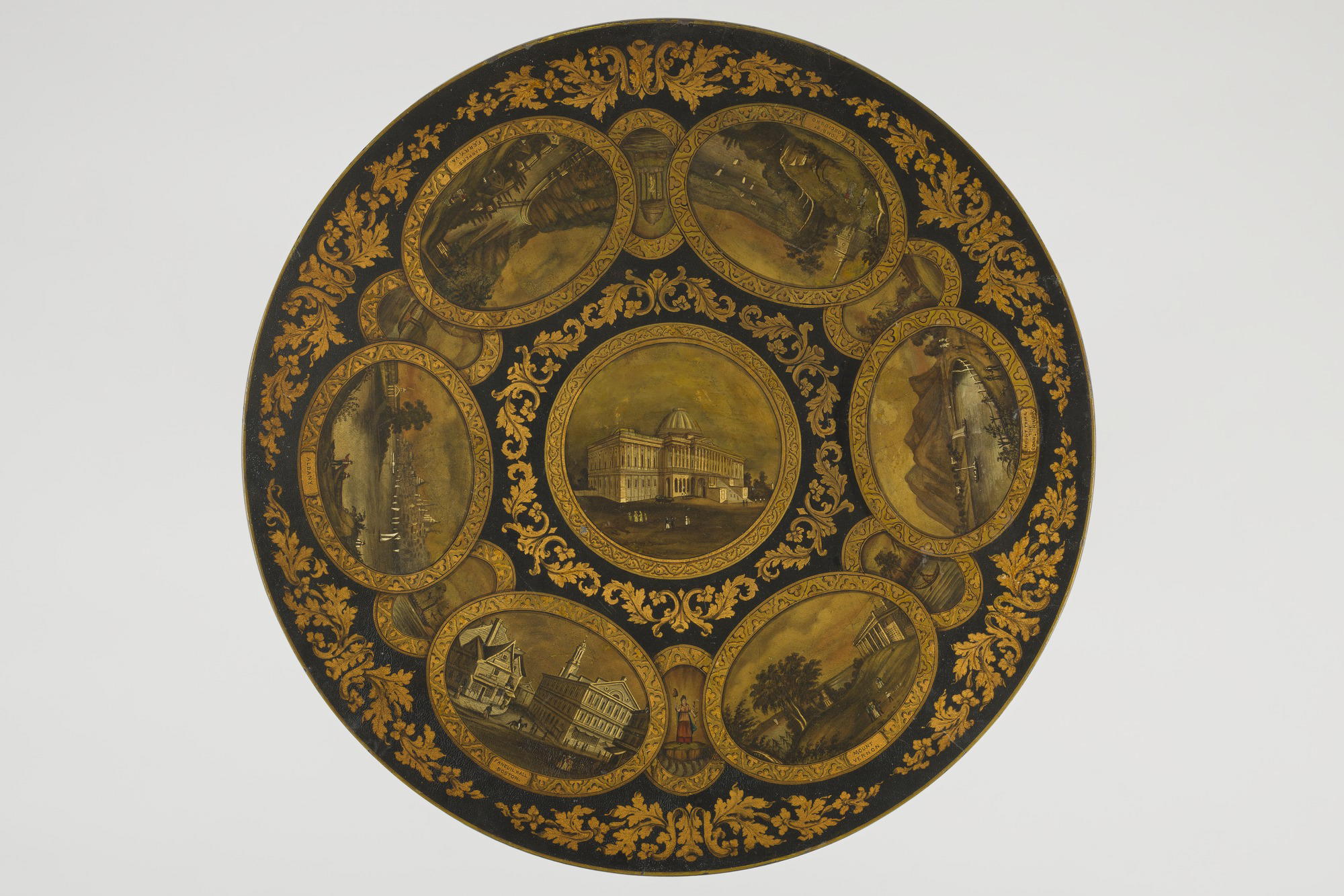 Artists inventively created topographical images in a variety of media to celebrate both local and national pride. Here, an assemblage of scenic icons decorates a painted wood tabletop, offering a picturesque tour of major cities and rural vistas in orbit around an image of the national Capitol. The scenes were based on prints published in 1840 in the illustrated volume American Scenery.