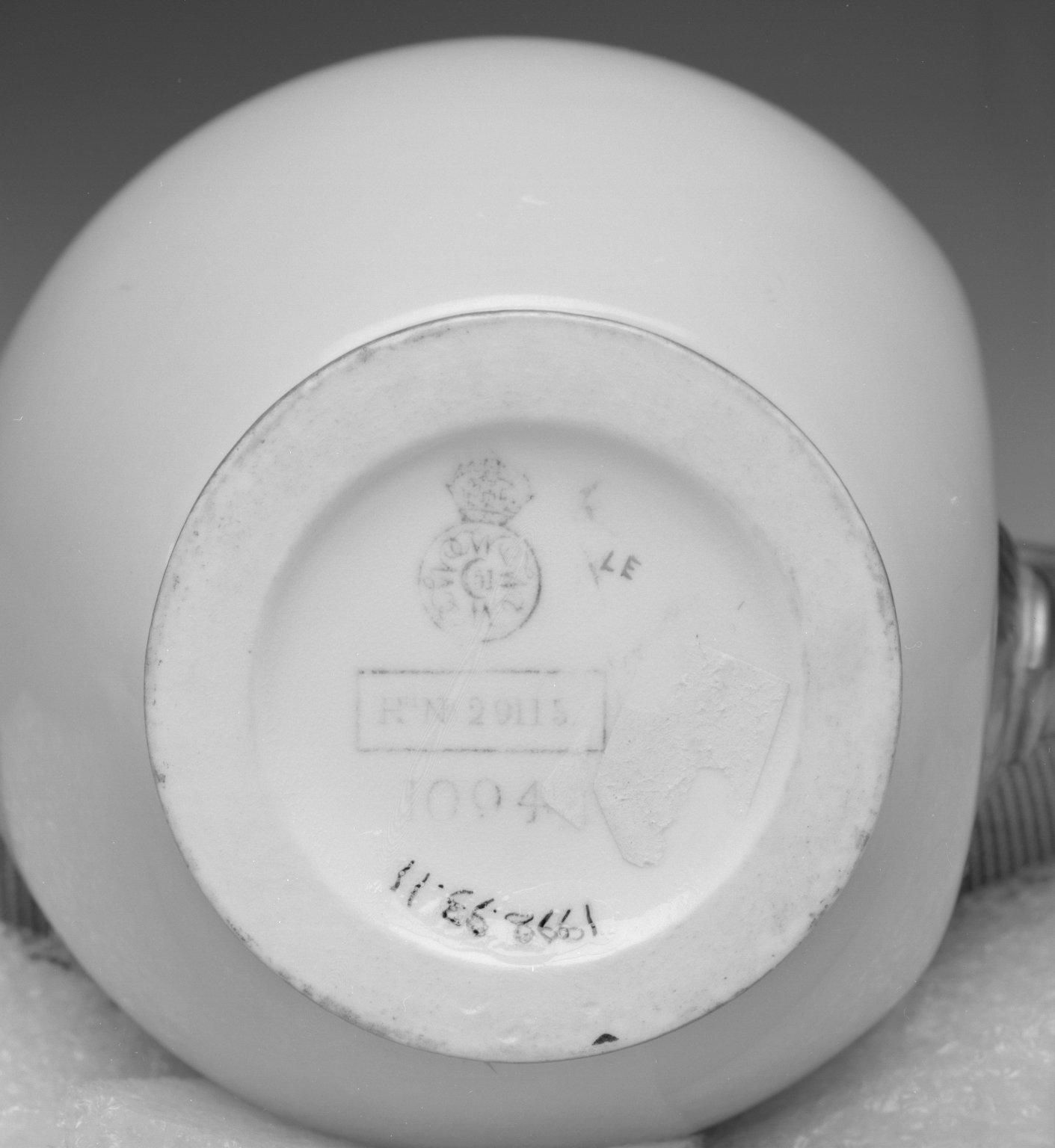 on bottom: transfer-printed in green is the Royal Worcester logo with crown. Transfer-printed in green below: "RdNo 29115." Transfer-printed in green beneath it: "1094." Hand-painted in orange on bottom: "LE."