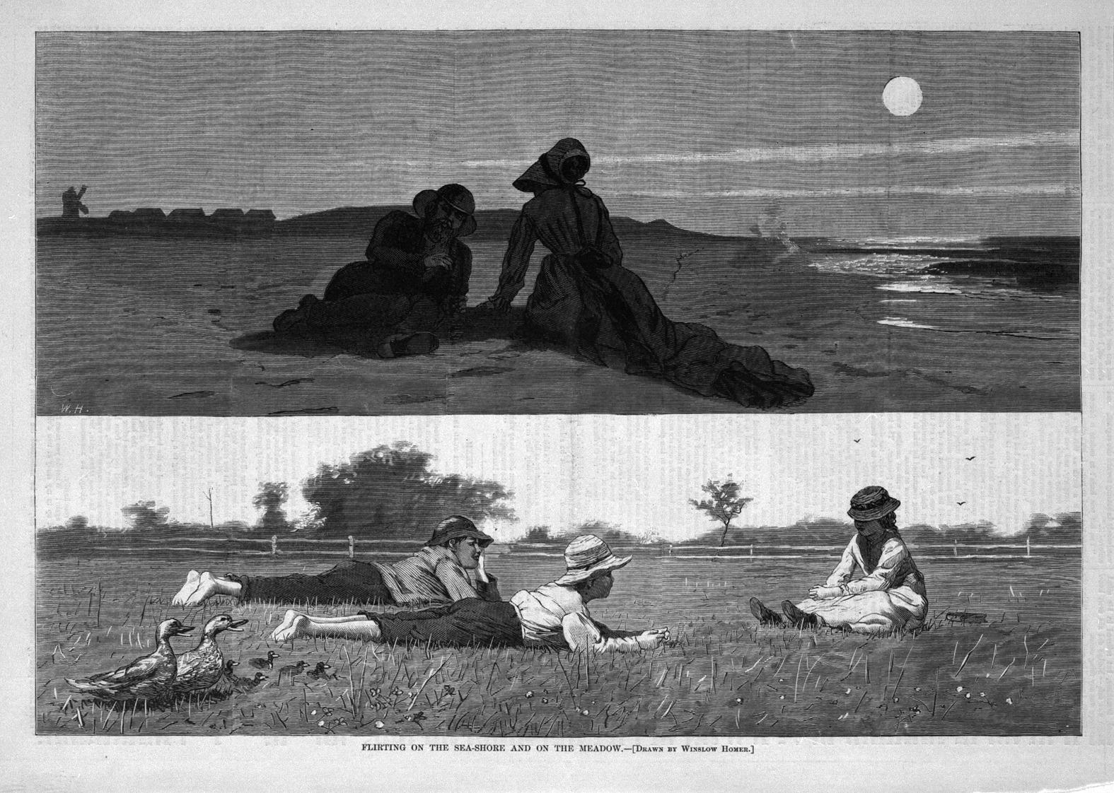 Winslow Homer (American, 1836–1910). Flirting on the Sea-Shore and on the Meadow, 1874. Wood engraving, Image: 9 1/4 x 13 5/8 in. (23.5 x 34.6 cm) Sheet: 11 x 16 1/4 in. (27.9 x 41.3 cm) Frame: 16 3/4 x 22 3/4 x 1 1/2 in. (42.5 x 57.8 x 3.8 cm). Brooklyn Museum, Gift of Harvey Isbitts, 1998.105.194. (Photo: Brooklyn Museum)