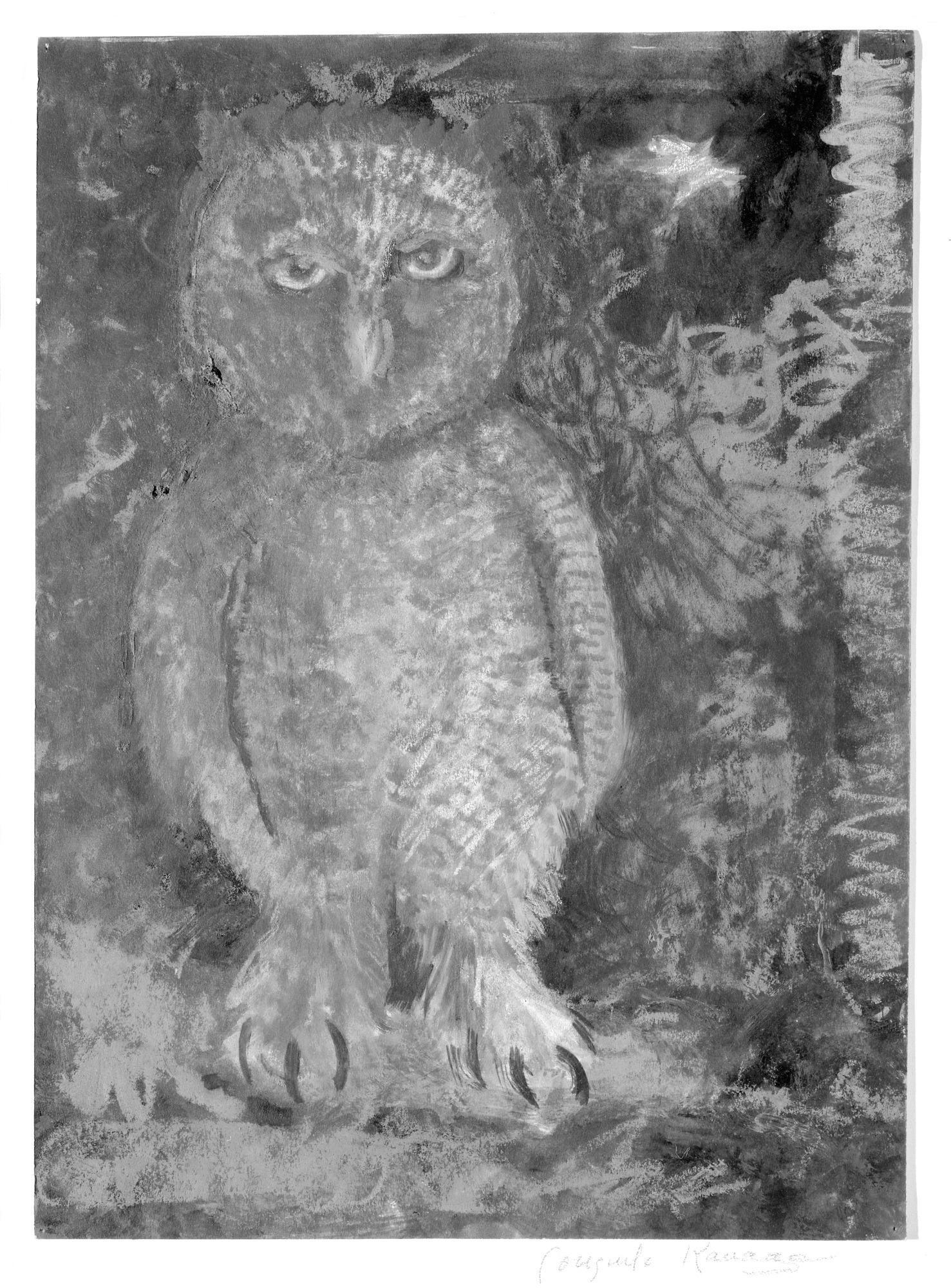 Consuelo Kanaga (American, 1894–1978). [Untitled] (Owl), Pastel and watercolor on paper, mounted, Sheet: 14 x 10 1/8 in. (35.6 x 25.7 cm); Support: 24 x 18 in. (61.0 x 45.7 cm). Brooklyn Museum, Gift of Wallace B. Putnam, 81.318.28. copyright transferred to Brooklyn Museum by the Estate of Wallace Putnam. (Photo: Brooklyn Museum)