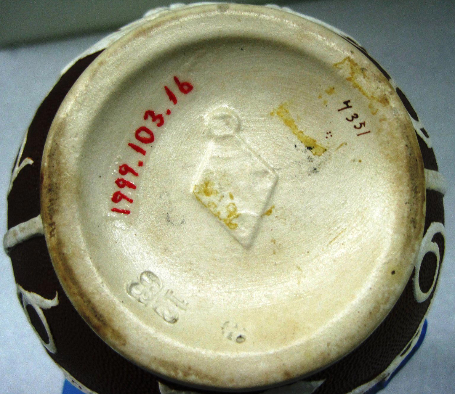 Underside,applied, white ceramic: "[registration mark]'; in brown paint near outer edge: '4351'; on opposite edge: '12/63'
