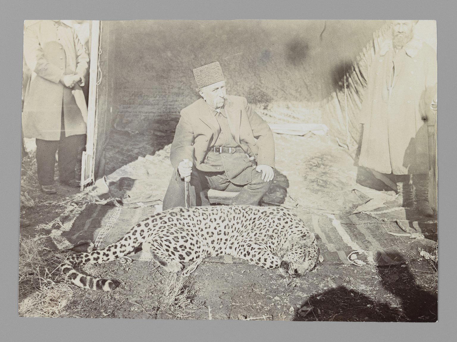 Mozaffar al-Din Shah Seated above a Hunted Leopard, One of 274 Vintage Photographs, late 19th–early 20th century. Gelatin silver printing on paper, 4 7/16 x 6 1/8 in. (11.3 x 15.6 cm). Brooklyn Museum, Purchase gift of Leona Soudavar in memory of Ahmad Soudavar, 1997.3.106. (Photo: Brooklyn Museum)