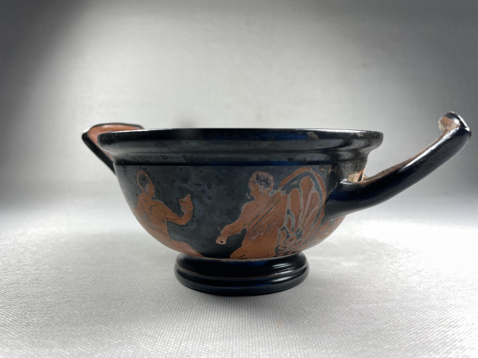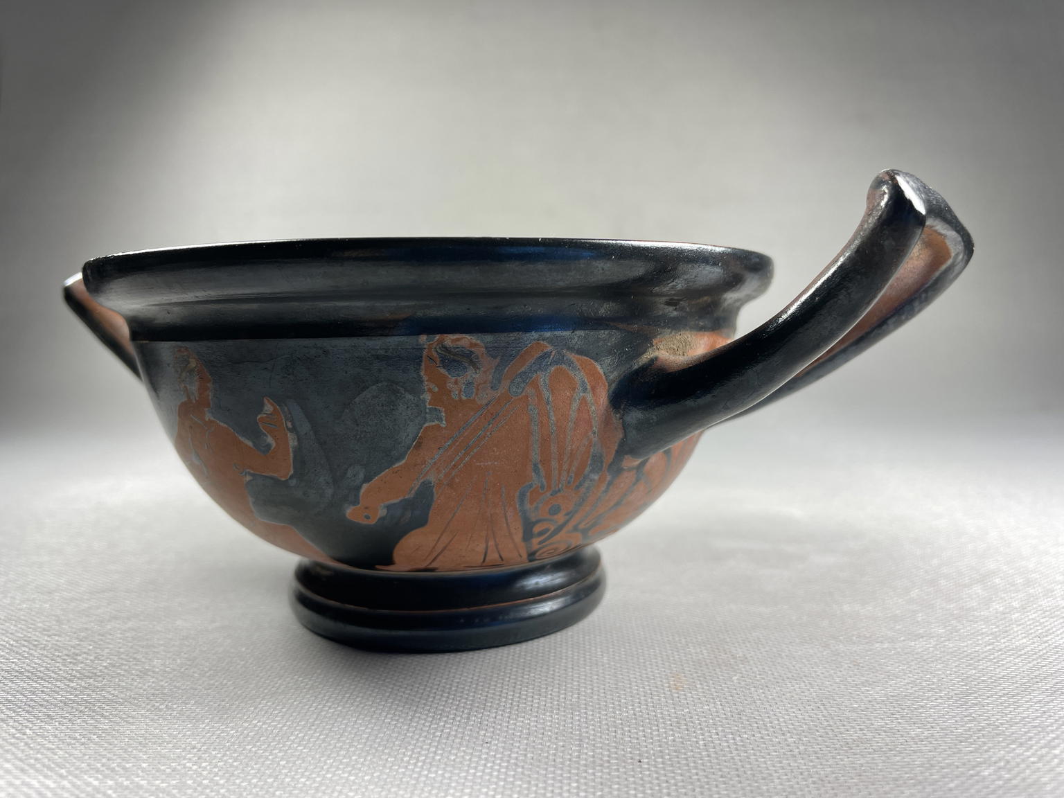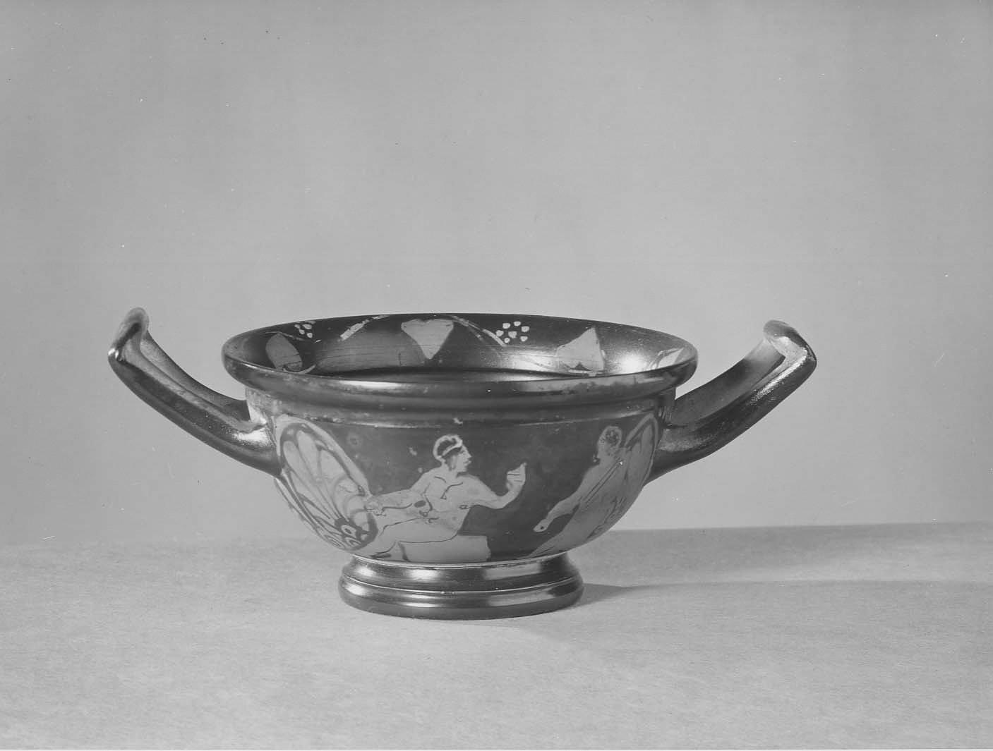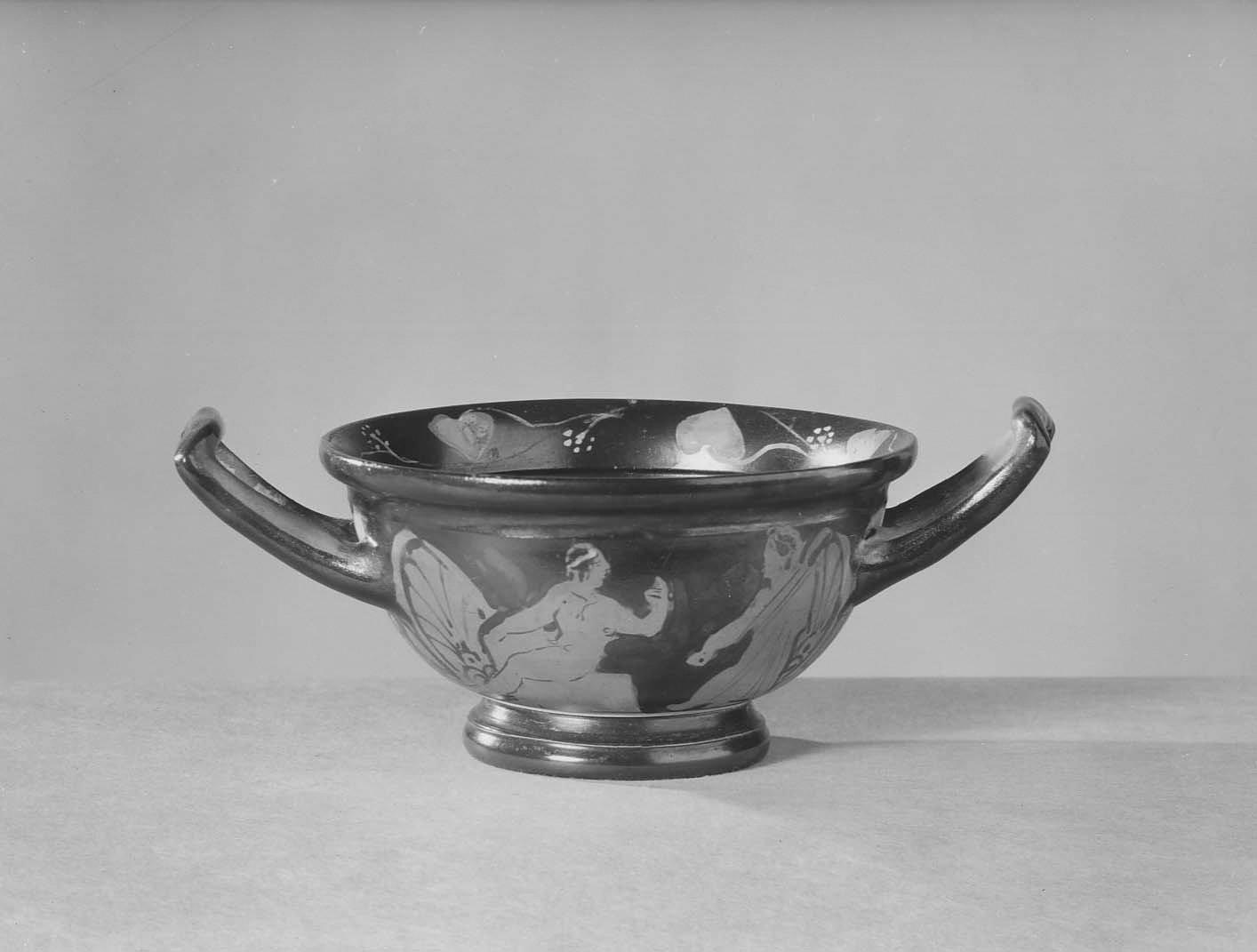 Greek; Attic. Red-Figure Skyphos or Kotyle, ca. 400 B.C.E.. Clay, slip, 3 9/16 × 5 1/16 × 7 1/2 in. (9 × 12.8 × 19 cm). Brooklyn Museum, Gift of Robert B. Woodward, 03.284. (Photo: Brooklyn Museum)