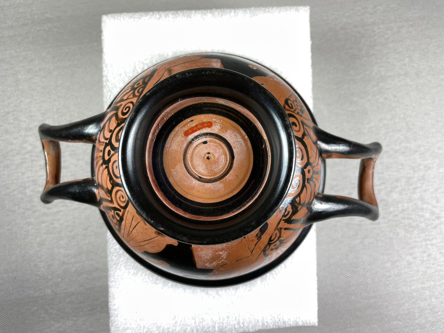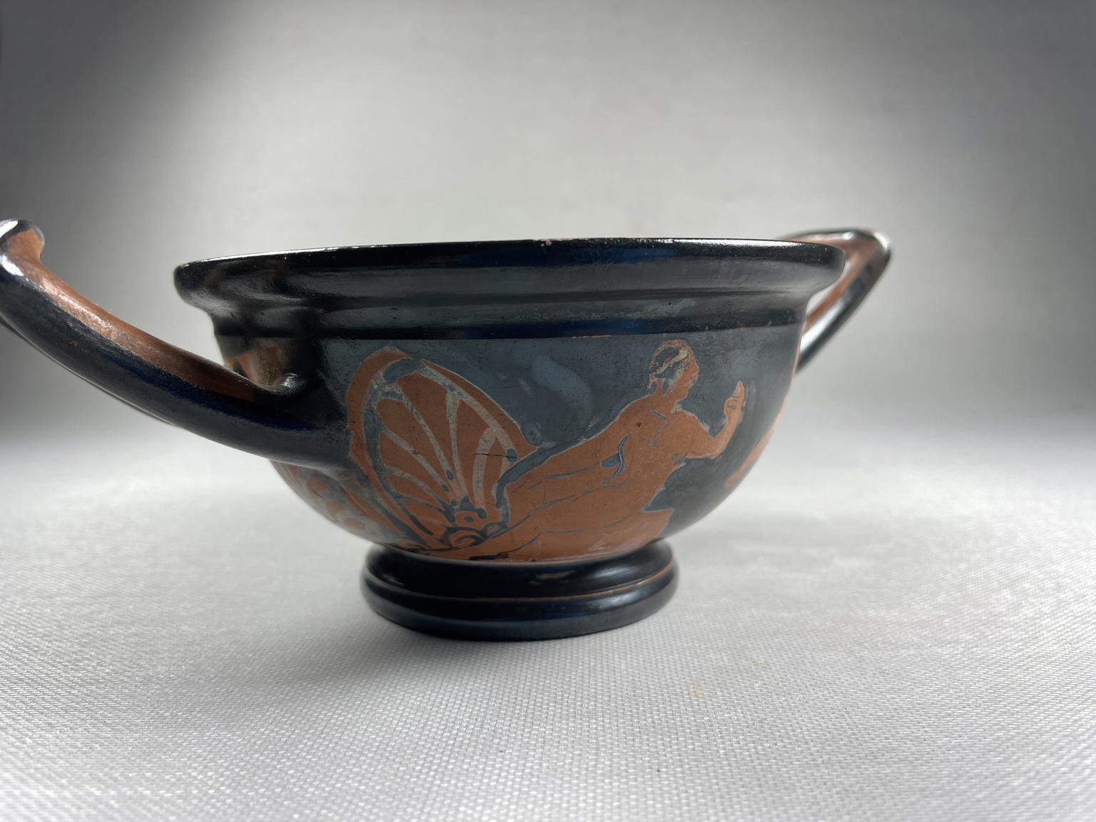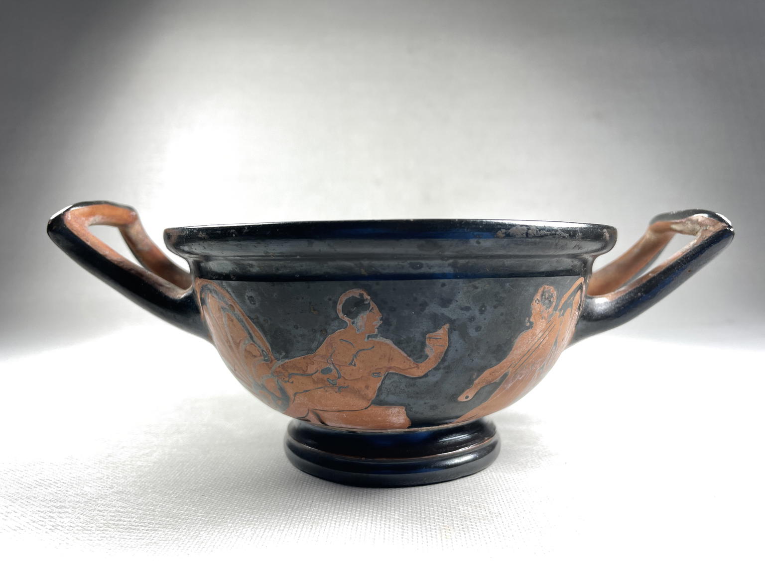 Greek; Attic. Red-Figure Skyphos or Kotyle, ca. 400 B.C.E.. Clay, slip, 3 9/16 × 5 1/16 × 7 1/2 in. (9 × 12.8 × 19 cm). Brooklyn Museum, Gift of Robert B. Woodward, 03.284. (Photo: Brooklyn Museum)