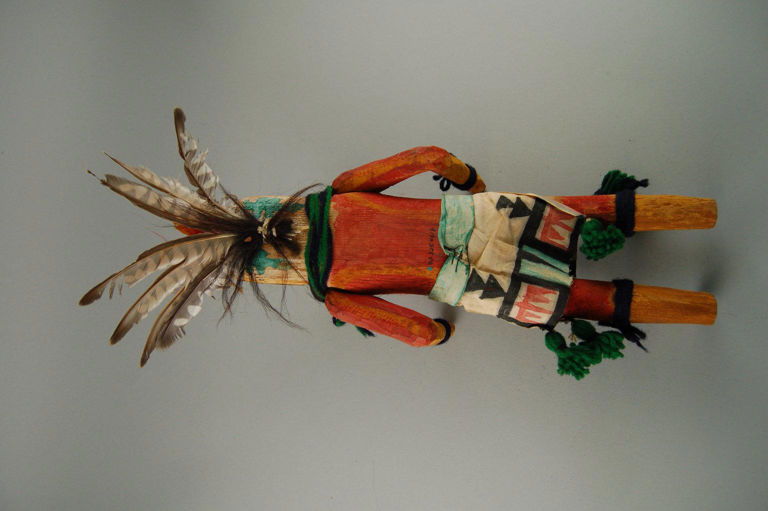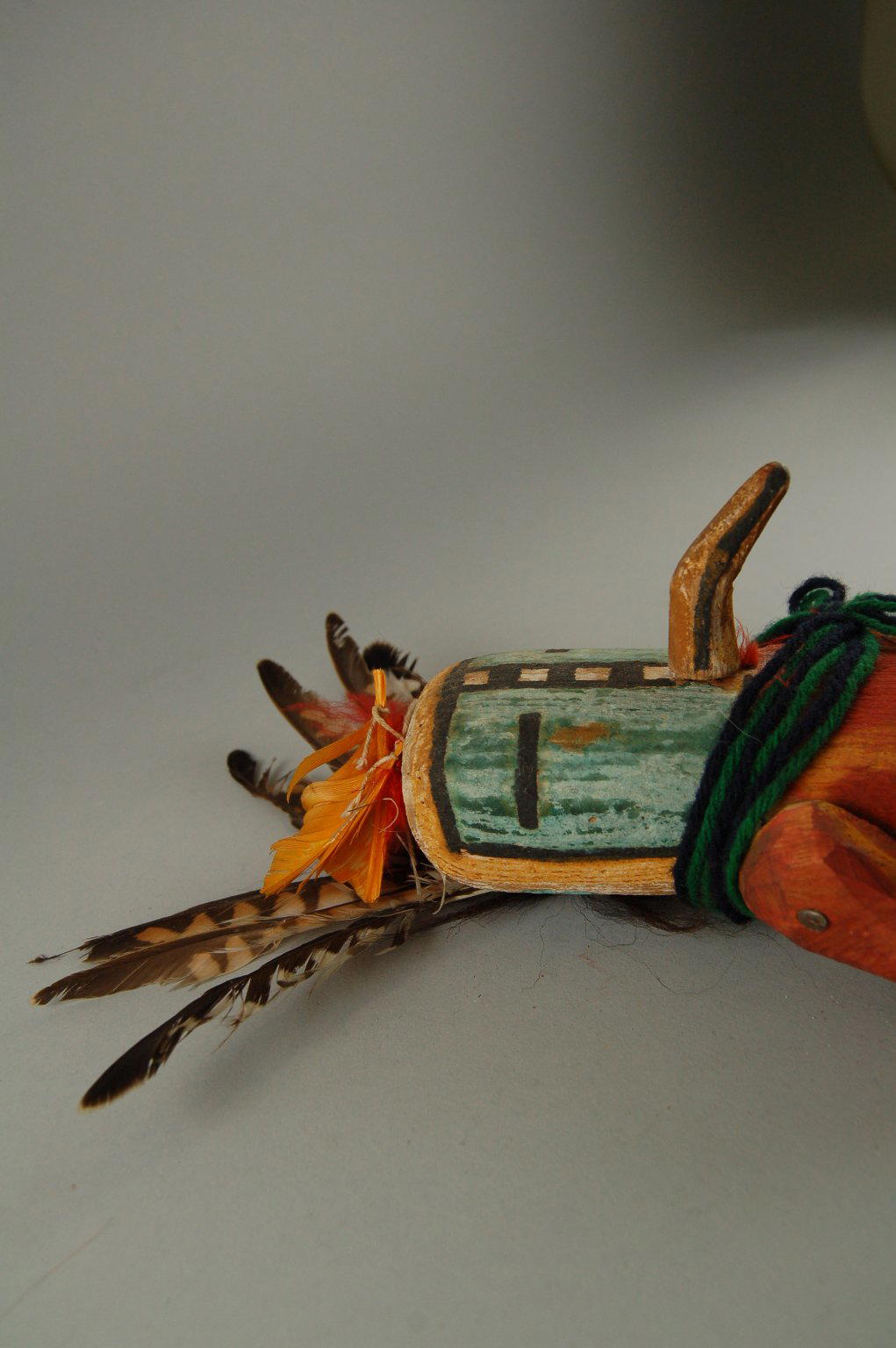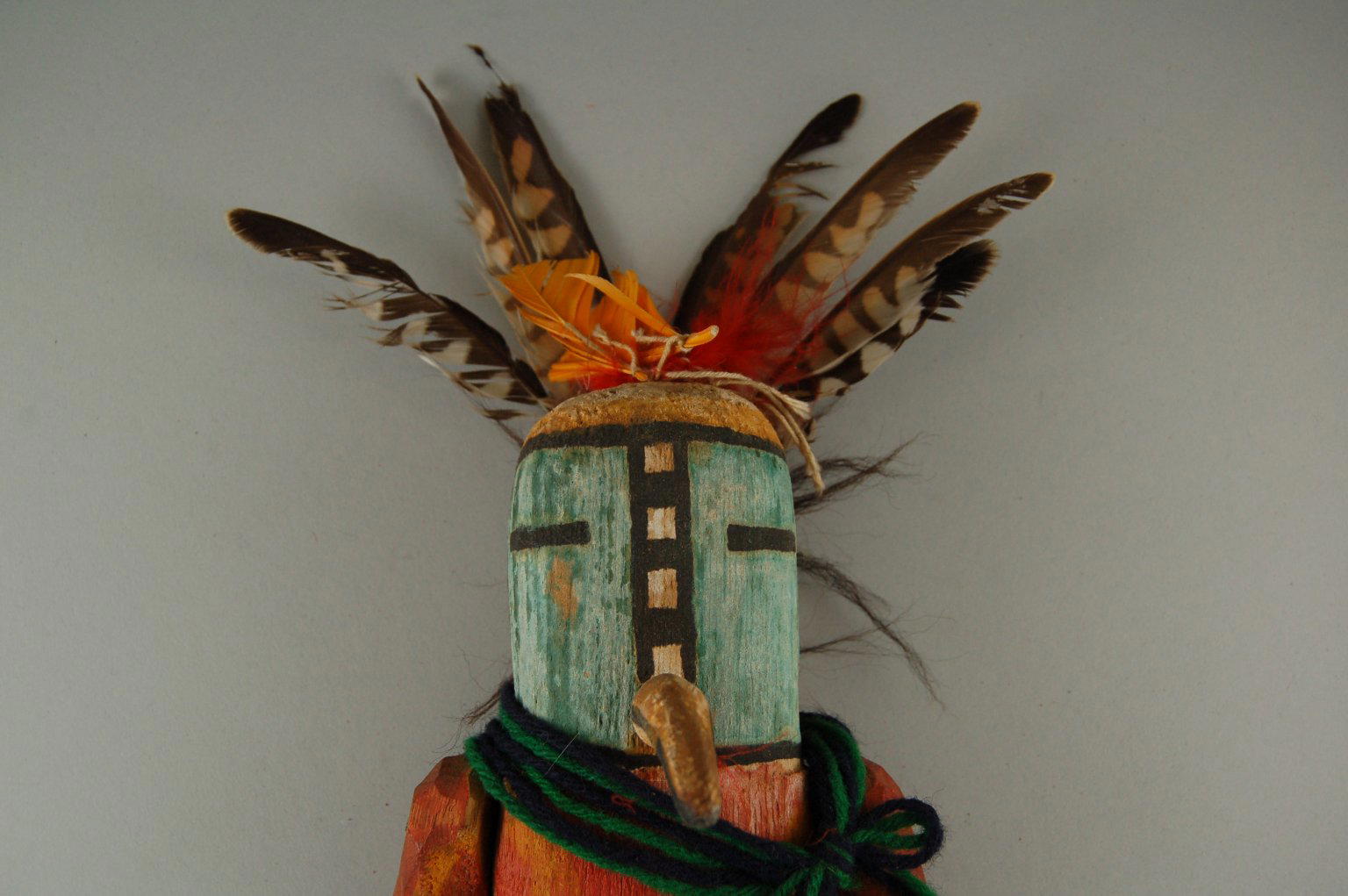 Turquoise, feathers, yarn, wood, cloth, string, pigment, nails, hair