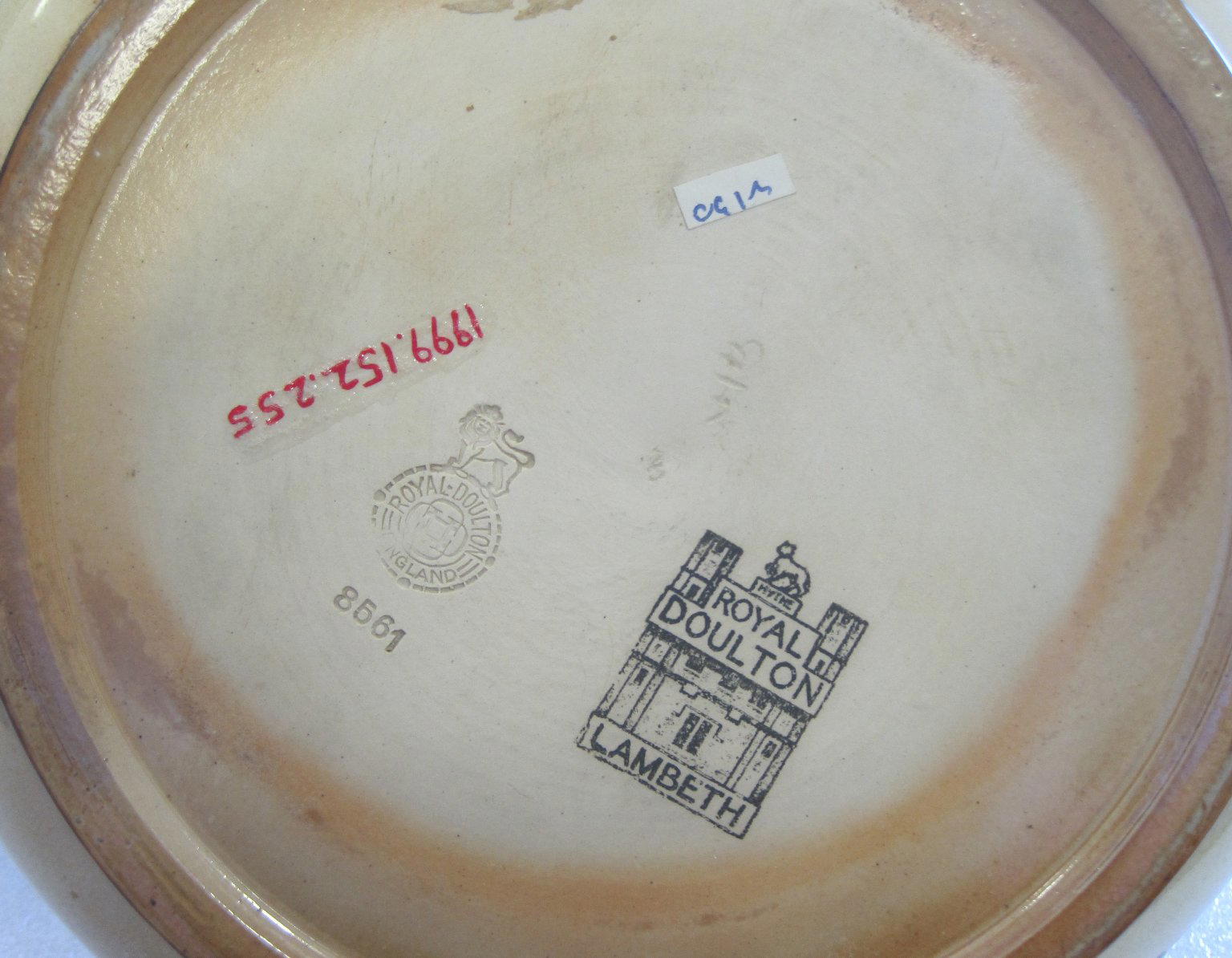 Transfer on underside of base: "ROYAL / DOULTON / LAMBETH" [Company logo with building] Imprinted on underside of base: "ROYAL DOULTON / ENGLAND" [Circular company logo surmounted by lion's body] / "8561" Handwritten in blue ink on paper label, underside of base: "0913" Incised on underside of base: [Illegible]