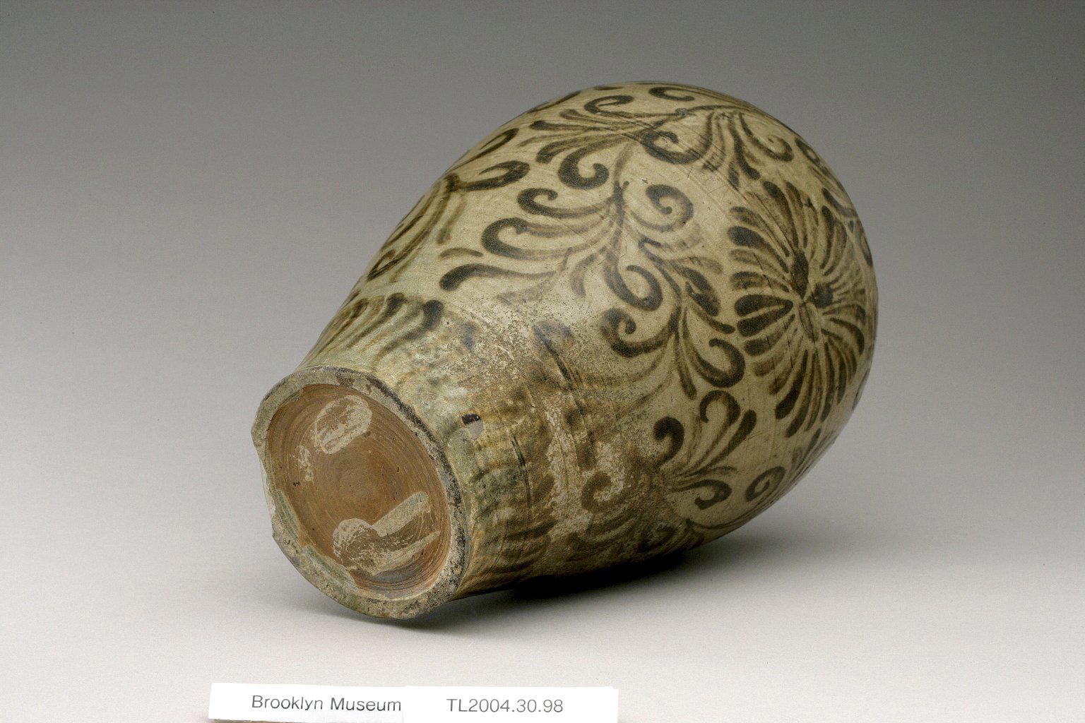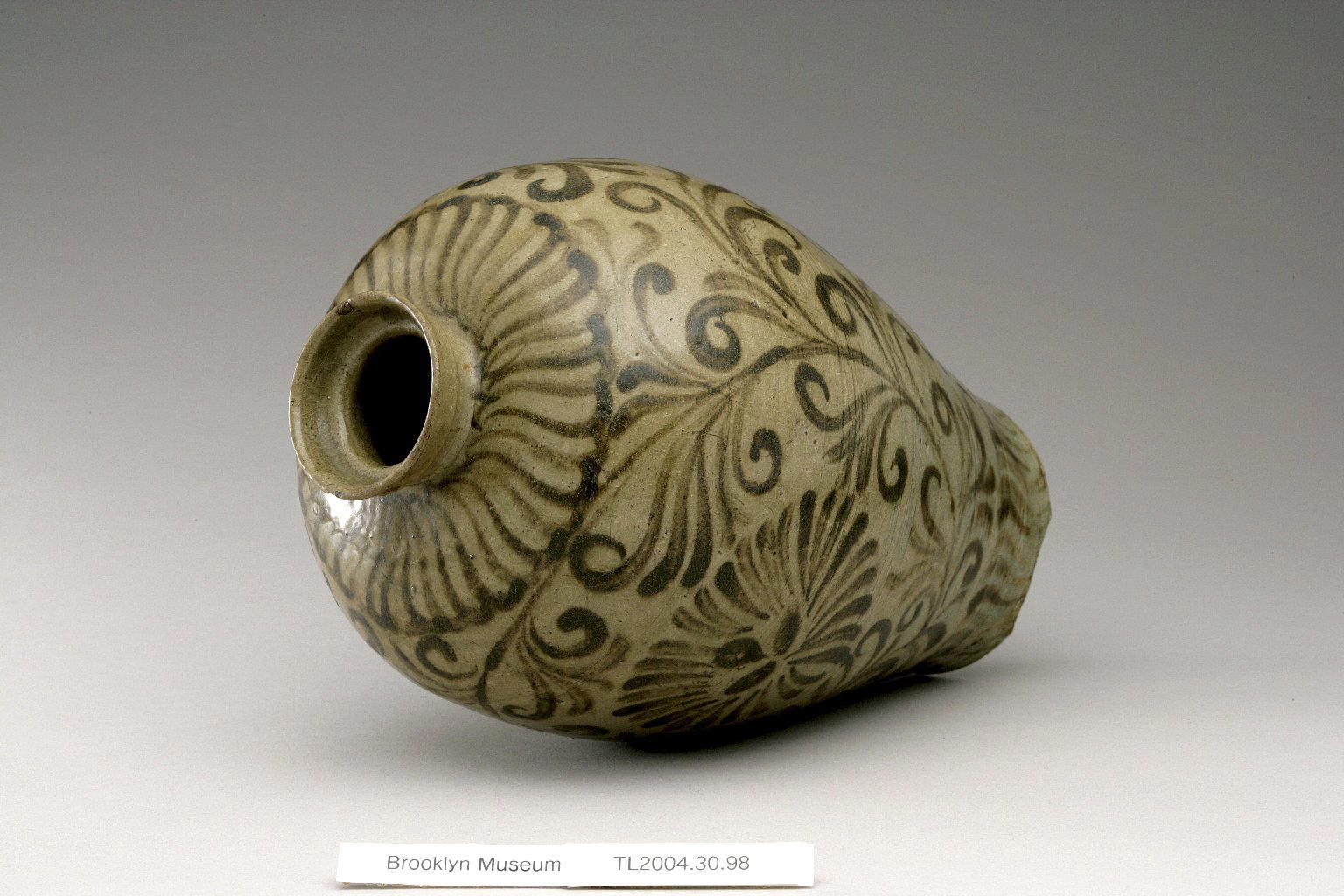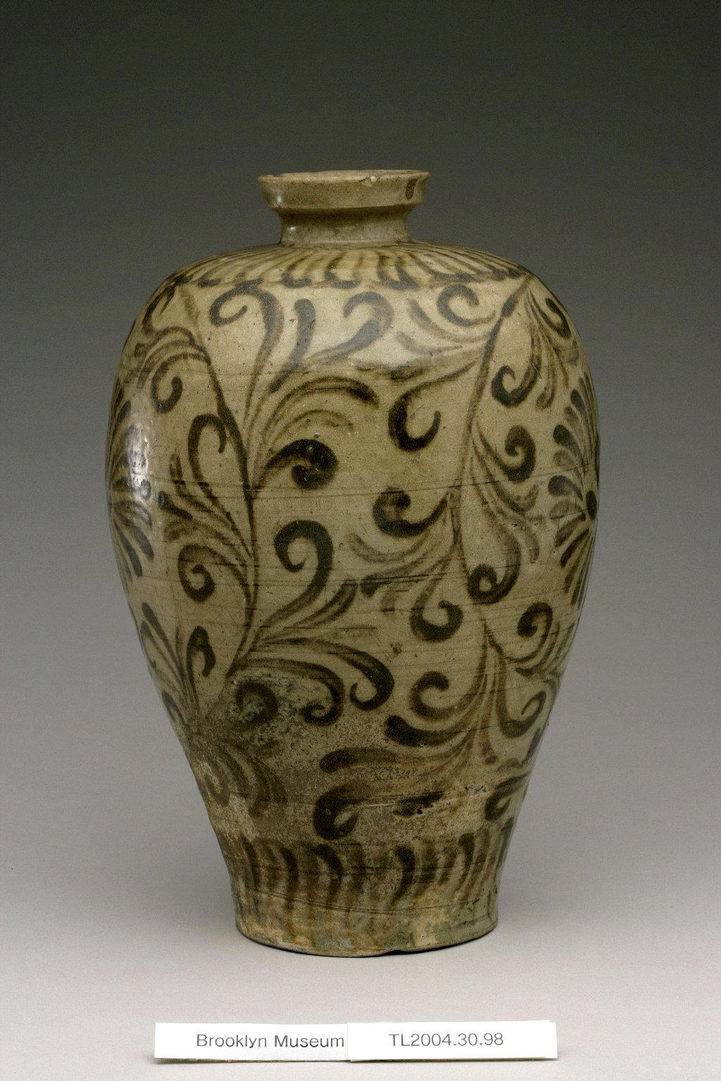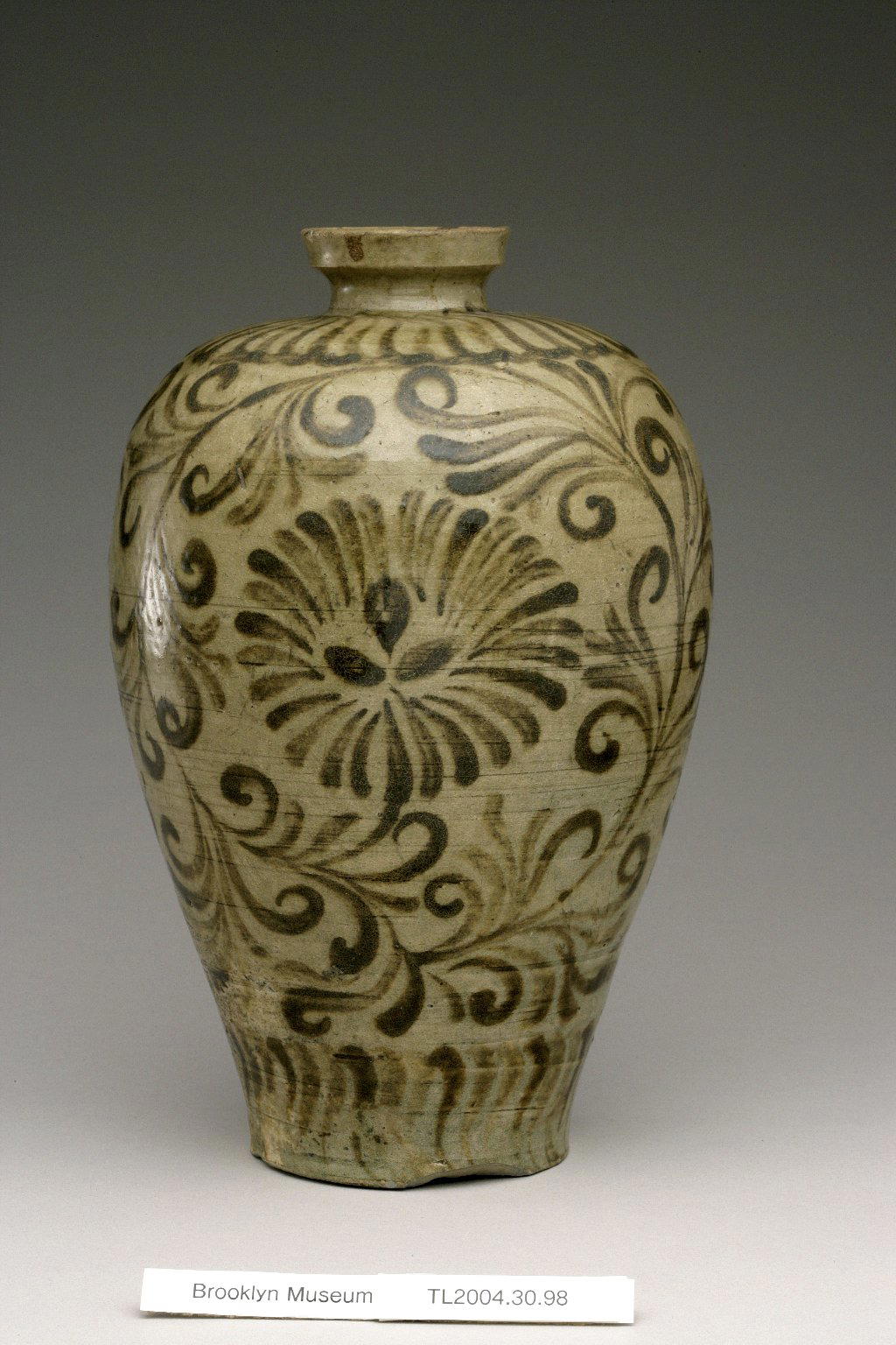 Vase, 12th century. Stoneware with celadon glaze and underglaze iron painting, 11 x 5 7/8 in. (28 x 15 cm). Brooklyn Museum, The Peggy N. and Roger G. Gerry Collection, 2004.28.116. (Photo: Brooklyn Museum (in collaboration with National Research Institute of Cultural Heritage, Daejon, Korea))