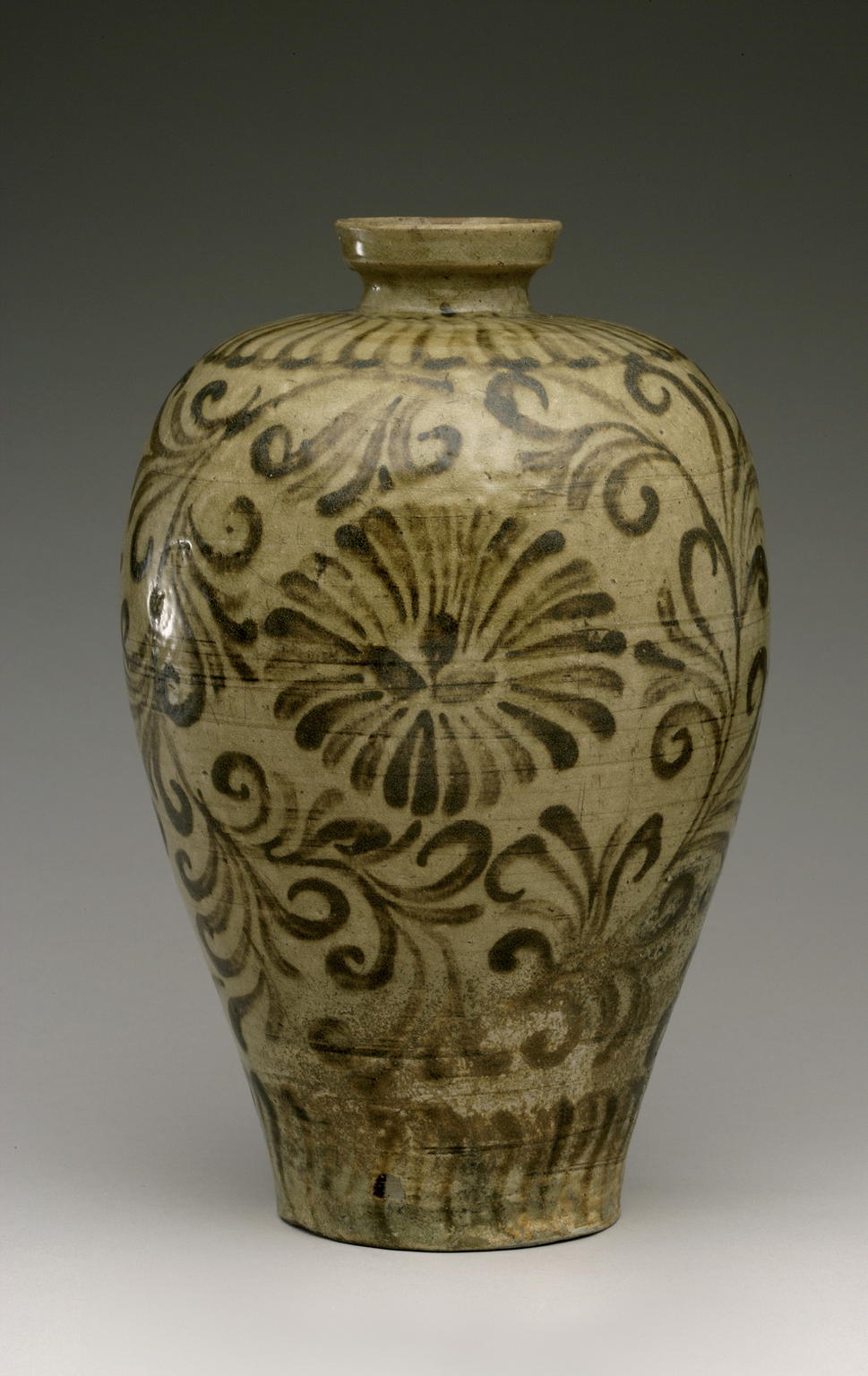 Vases of this shape, known as maebyeong in Korean and meiping in Chinese, were used for display of single branches from flowering trees. These examples represent two early attempts to add another color to celadon-glazed ceramics. The clouds on one vase were painted directly onto the gray body in liquid white clay (slip) and then covered with the nearly clear green glaze. Although appropriate for the depiction of clouds, this kind of watery, freehand decoration would prove to be difficult to control and would be replaced soon after by inlaid decoration. The iron-brown painting on the other vase was also applied under the glaze, and in this case the iron affected the color of the glaze—another problem that would be alleviated by the invention of inlaid decoration.