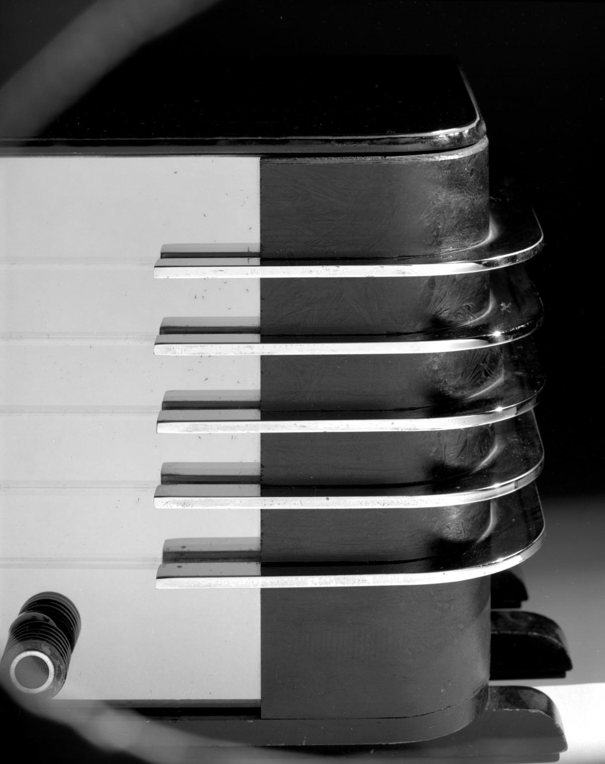 Isn't it great? This radio resembles an automobile grill and dashboard. Although this model was made for the home, radios were developed for cars beginning in the 1930s. Just as the radio brought news of the public world into the private family home, this radio would have brought the machine aesthetic, first seen in factories and public spaces, into a domestic setting.Wow!