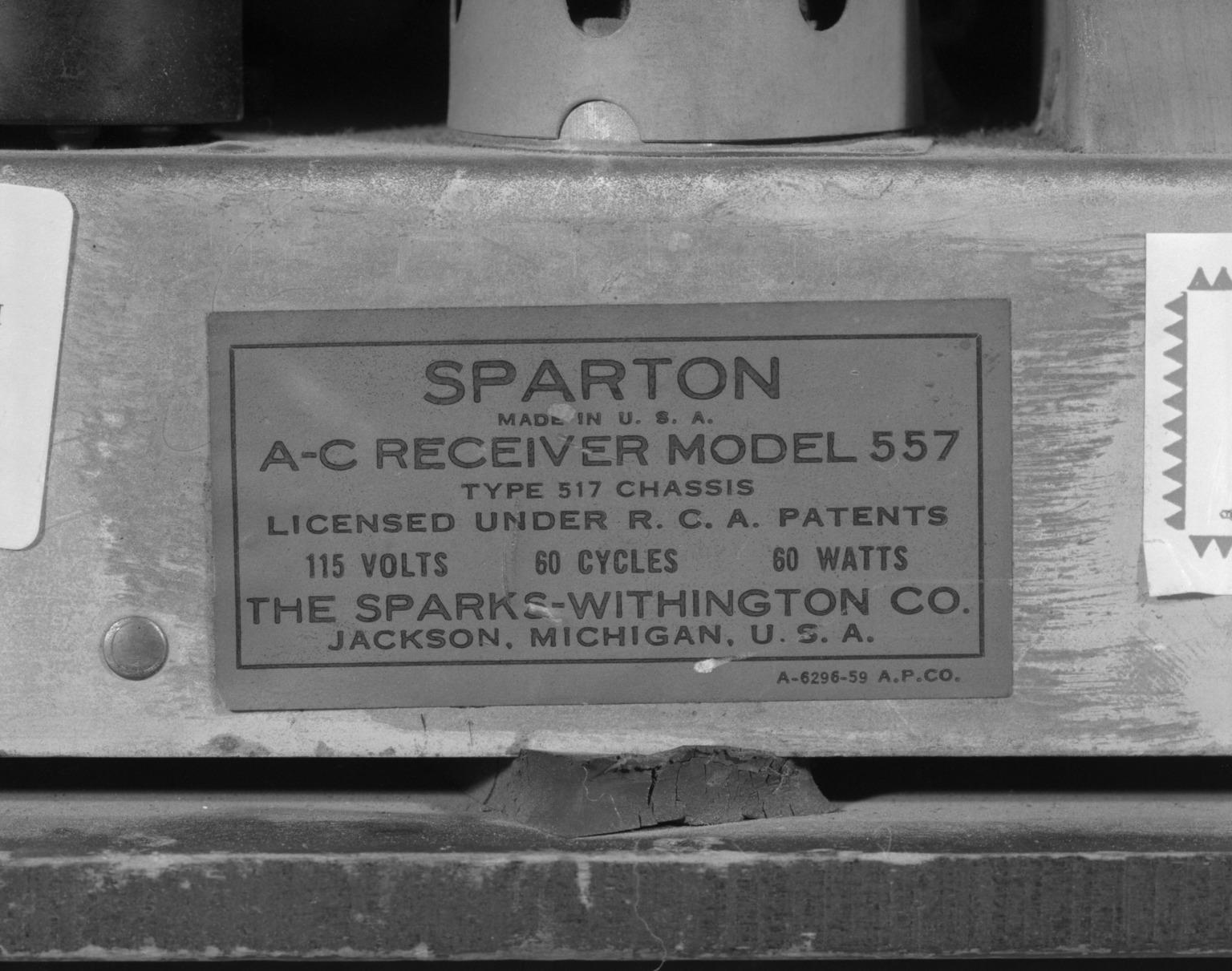 Paper label applied to tube base / transformer inside radio: "SPARTON / MADE IN U.S.A. / A-C RECEIVER MODEL 557 / TYPE 517 CHASSIS / LICENSED UNDER R.C.A. PATENTS / 115 VOLTS 60 CYCLES 60 WATTS / THE SPARKS-WITHINGTON CO. / JACKSON, MICHIGAN. U.S.A. / A-6"