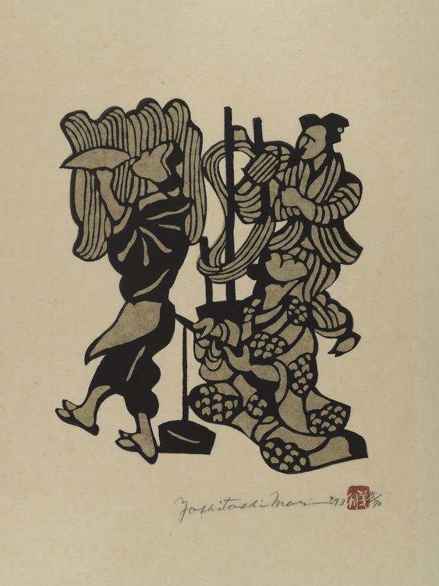 Mori Yoshitoshi (Japanese, 1898–1992). [Untitled] (Three Entertainers), 1973. Woodblock print, Other (Sight): 17 7/8 x 12 3/8 in. (45.4 x 31.4 cm) Frame: 24 5/8 x 18 5/8 in. (62.5 x 47.3 cm). Brooklyn Museum, Gift of the Estate of Dr. Eleanor Z. Wallace, 2007.32.40. © Estate of Mori Yoshitoshi. (Photo: Brooklyn Museum)