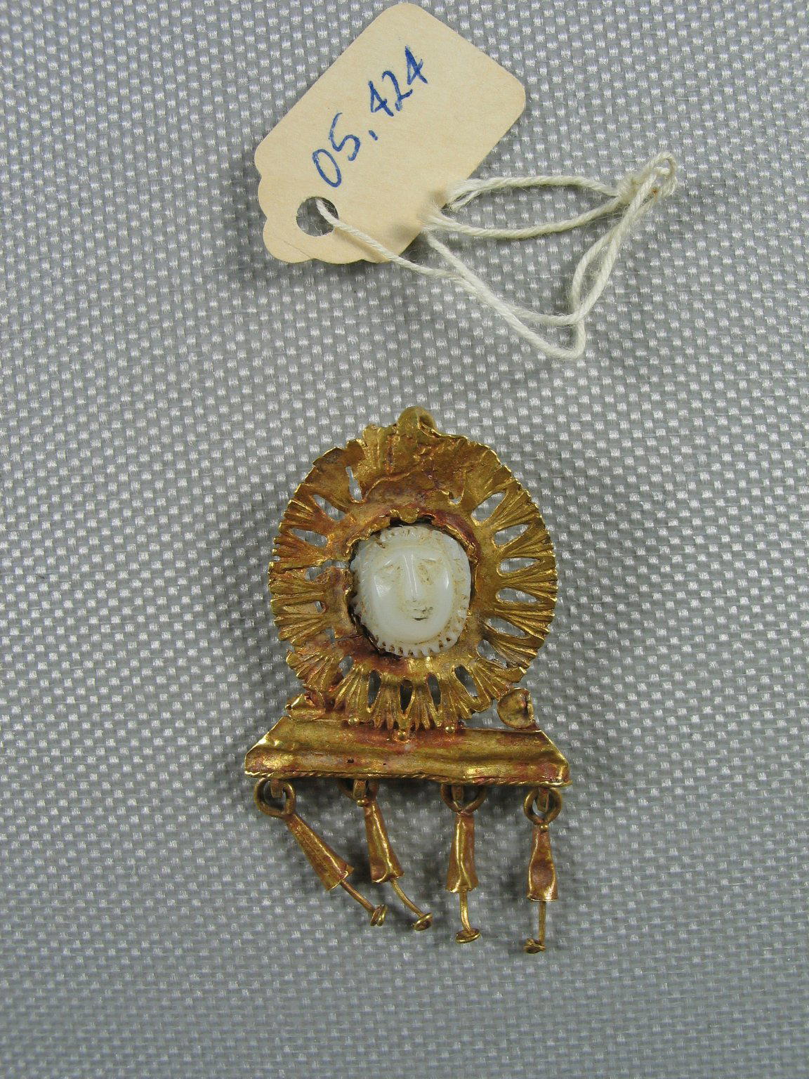 Roman. Earring, 3rd century C.E.. Gold, stone, 1 x 1 3/4 in. (2.6 x 4.4 cm). Brooklyn Museum, Ella C. Woodward Memorial Fund, 05.424. (Photo: Brooklyn Museum)